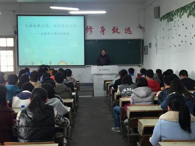新生作了一场安徽师大博物馆概论的专题报告。报告会于下午2点30分在教学楼1302教室举行, 120名16级新生参加报告会,讲座由辅导员王国良主持。