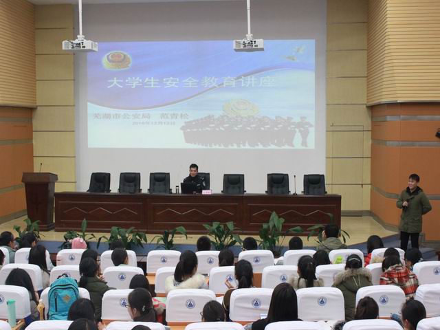 王国良) 为普及校园安全知识,切实提高大学生自我防范意识,12月13日晚7点,学院邀请到芜湖市公安局警务技战术教官、城东新区派出所刑侦民警范青松做了一场校园安全教育讲座,讲座由2016级辅导员王国良主持,全体2016级新生参加学习。