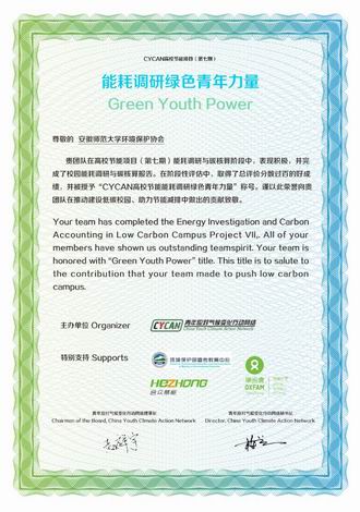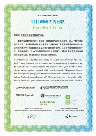 )由“青年应对气候变化行动网络(中国)” (CYCAN)等公益组织联合举办的全国“高校节能7.0校园低碳项目”日前已圆满结束,在为期三个月的项目实施和评比中,安徽师范大学环境保护协会从浙江大学、兰州大学等全国57所重点高校队伍中脱颖而出,斩获第四名的好成绩,并荣获“全国十佳优秀团队”、“CYCAN高校节能第七期绿色能量”等称号。