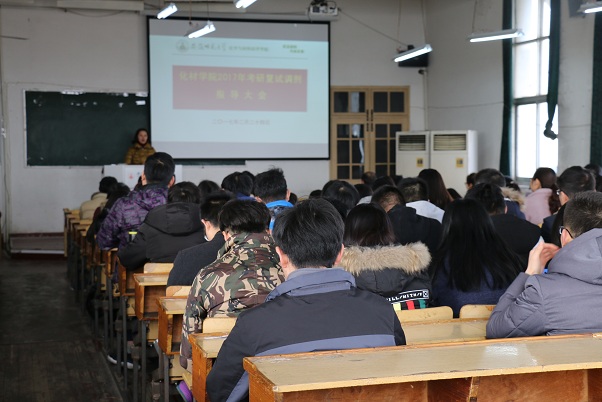 在教学楼1410教室举办了考研复试调剂指导大会,学院教学院长张小俊、科研院长周双六、材料化学系主任王正华、化学工程与工艺系副主任周映华、毕业班辅导员、2017届考研学生参加了指导会。会议由学院党委副书记余妍霞主持。