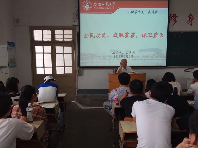 关工委副主任、环境保护协会指导老师宫世国老师受邀为化材学子做了一场题为“全名动员、抗击雾霾、共享蓝天”的报告。环境保护协会骨干成员、2016级各专业共120余名学生代表参与学习,讲座由辅导员王国良主持。