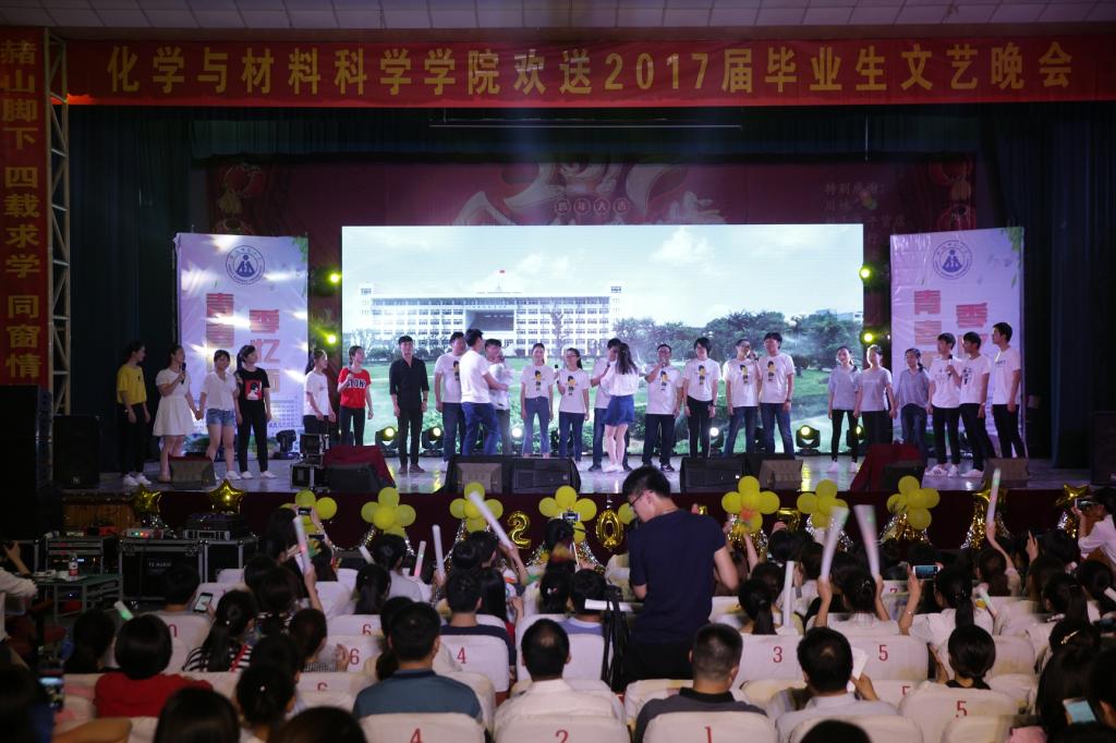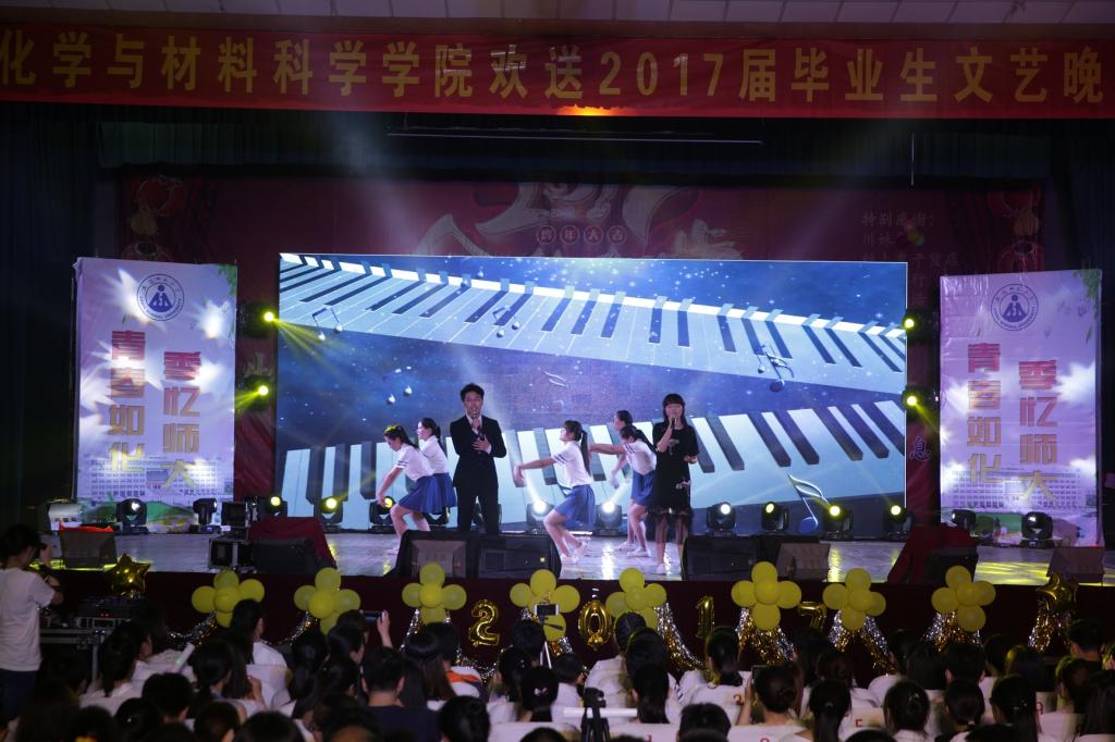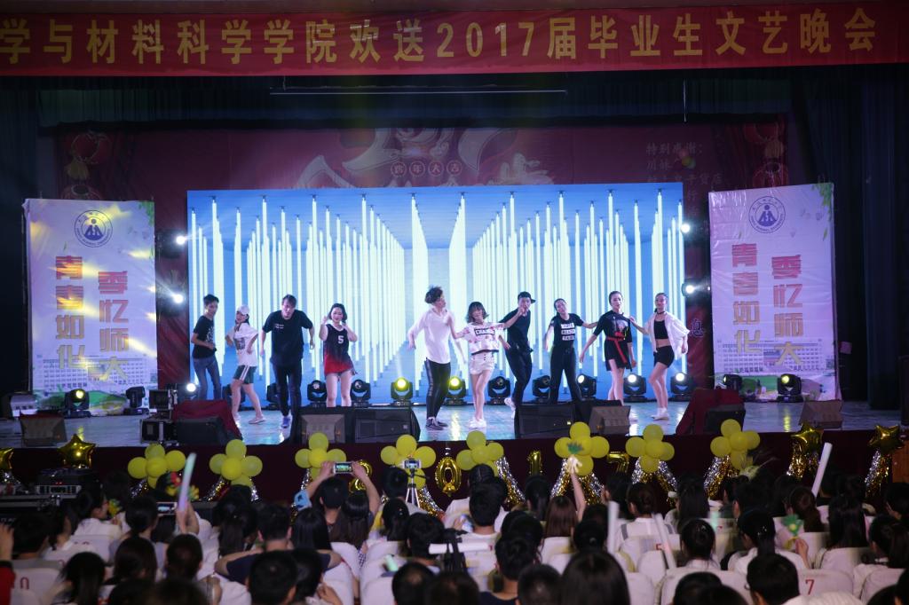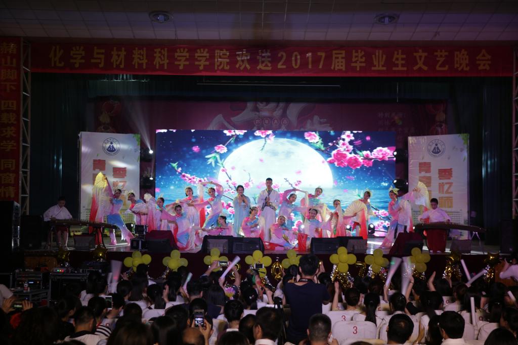 本次晚会在开场舞《向快乐出发》中拉开序幕,青春动感的音乐和肆意激情的舞姿在开场便点燃全场的气氛,尽显别样的 ‘化’样年华。灼灼桃花艳,浅浅离别芳。由季长春老师和环境保护协会推选的歌舞表演《十里桃花凉》用轻盈的绸扇衬托出舞者曼妙的舞姿,展现出了毕业生对于母校的深深眷恋之情。个唱队带来的歌曲串烧《歌与》独具匠心的将歌舞与武术、书法交融为一体,动静互衬之间尽显学院的深厚底蕴。诗朗诵《甘南的呼唤》用朴实的词汇表达出了支教的辛苦,以及对支教人的崇高敬意,体现了化材学子不惧艰险敢于当先的优秀品质。
