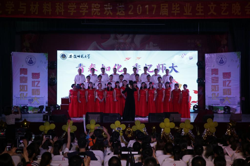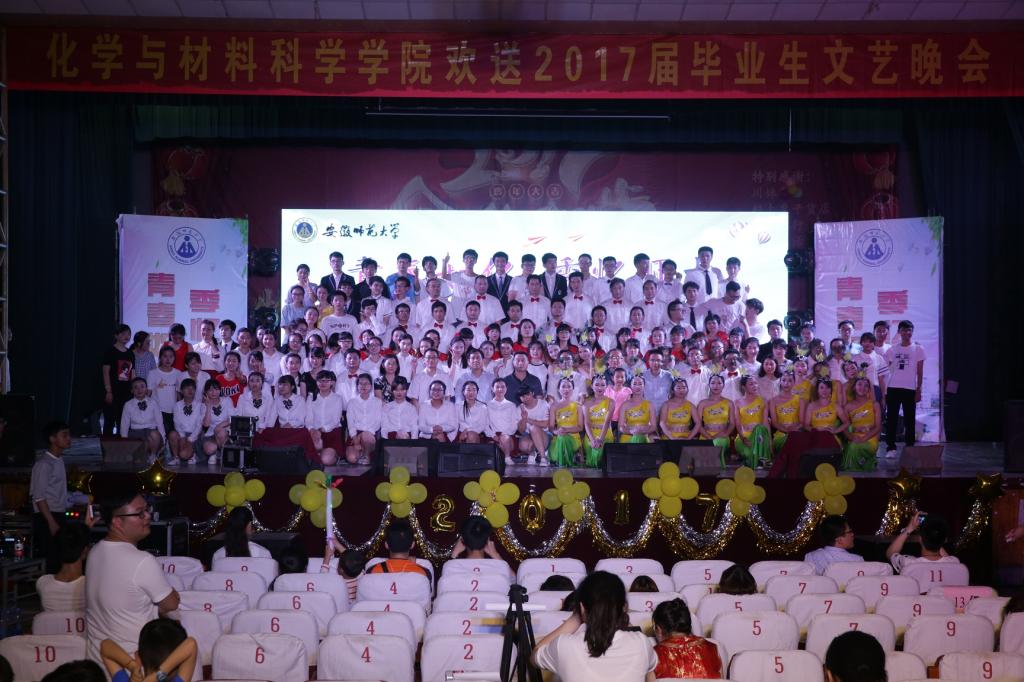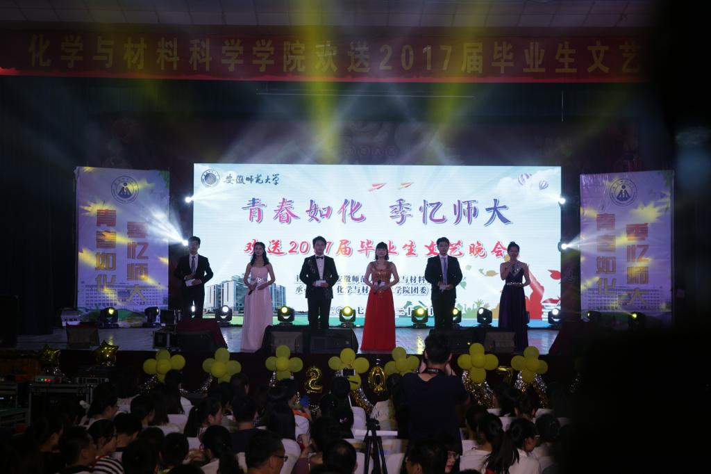 “青春如化,季忆师大”欢送2017届毕业生文艺晚会在赭山校区大礼堂隆重举行。本次晚会分为“浓缩·同学少年,风华正茂”、“沉淀·青春华章,如诗如梦”、“结晶·逐梦起航,砥砺前行”三个篇章。校纪委书记程度、党委组织部部长季爱新、教务处副处长李汪根、人事处副处长王标、校团委副书记汪凯等领导应邀莅临晚会现场。学院全体党政领导及近千名师生共同观看了本场晚会,为2017届毕业生送上真诚祝福。