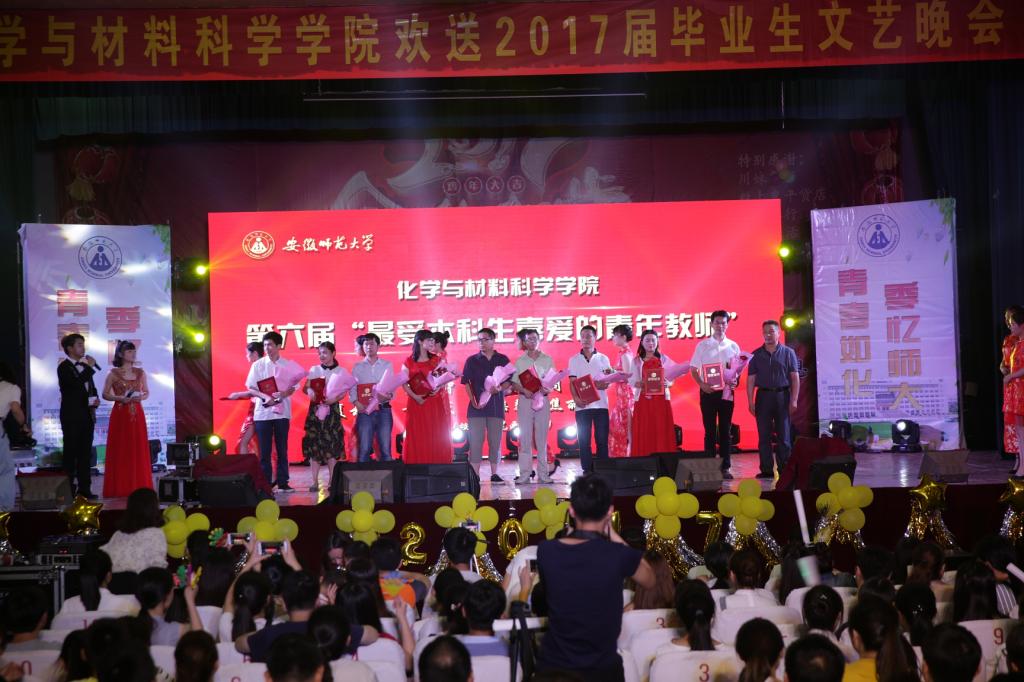 春日清风送爽,绿荷生机昂扬。毕业生节目《荷韵》将傣族舞蹈与绿裙红伞紧密的融合在一起,一收一放,一摆一动之间尽显学院学生不尽的青春活力。器乐合奏《Dream it possible》将一个励志的故事融于合奏中,通过舞姿展示出化材人在遇到磨难时永不言弃的精神。合唱团带来的大合唱《我的梦》用化材院最高亢的声音唱出了化材院毕业生对于梦想的渴望与追求。孙益民老师和同学们一起带来的《北京东路的日子》用口琴、吉他演绎别样的大学生活,勾起了毕业生们对于学院回忆的无限眷恋。师德风韵,薪火相传。师生恩情永难忘,晚会上,由毕业生评选出的10名第六届“最受本科生喜爱的青年教师”登上舞台,校纪委书记程度为获奖教师颁奖,学生代表送上鲜花感谢师恩。夏云生老师代表获奖教师表达了对毕业生的深情祝福和殷切期望。
