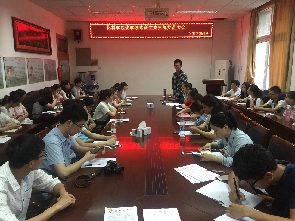 化学系本科生党支部在学院二楼会议室召开专题理论学习会,重点推进支部“两学一做”学习教育常态化和制度化,化学系本科生党支部12名正式党员、21名预备党员和8名发展对象参加了理论学习会。会议由支部书记蒋建伟主持。