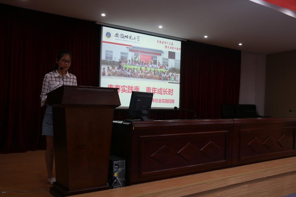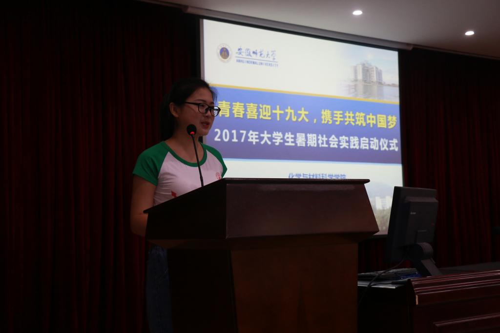 2017年大学生暑期“三下乡”社会实践活动启动仪式在赭山校区图书馆报告厅举行。校团委副书记刘长生,院党政领导班子,院社会实践思政理论指导教师张涛,化学系主任阚显文,化工系主任罗时忠,材化系主任王正华,院实践团队指导老师代表列席参会。校院班三级实践团队队员代表120余人参加了仪式,仪式由学院团委副书记蒋建伟主持。