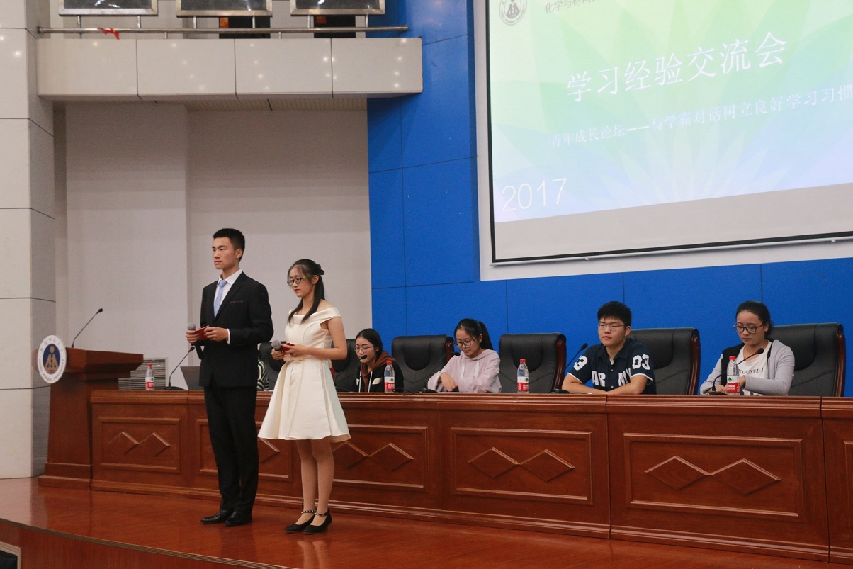 于2017年10月13日晚在花津校区图书馆报告厅隆重召开学习经验交流会。学院邀请国家奖学金获得者、励志奖学金获得者、朱敬文奖学金获得者以及校一等奖学金获得者作为嘉宾为新生做学习经验交流。韩芬,尹梦菇,陆洋绵,黄月,王瑞,杨倩云这六位出类拔萃的“学霸”应邀而来。化材新生齐聚于此,聆听学长学姐经验所得珠玑之语,领略化材佼佼学子魅力风采。