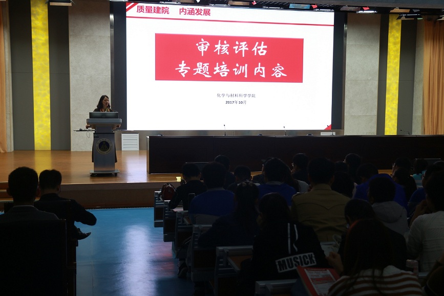 会议尹始,副院长张小俊用生动形象的语言对本科教学审核评估进行了背景介绍。他通过“什么是审核评估”、“审核评估的范围”、“审核评估的流程”和“审核评估的作用”四个方面向全体同学普及相关知识。张副院长强调,在专家进校考核环节中,专家将以学生的日常学习生活为切入点,围绕课堂、寝室、实验室等多个方面展开评估考核。考核方式包括了随机听课、召开座谈会、抽查寝室、检验专业技能等多方面、多角度的综合性考核方式。因此同学们在面对专家进校考核环节中一定要展现出师大人、化材人的精神风貌,端正态度,在学习与生活多个方面均要做到严于律己。