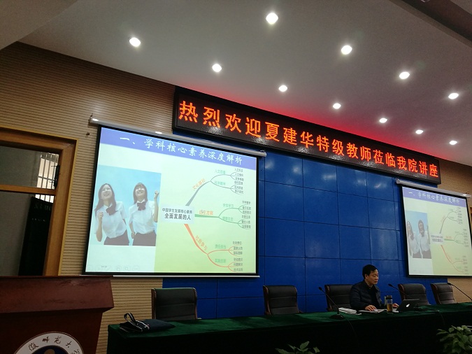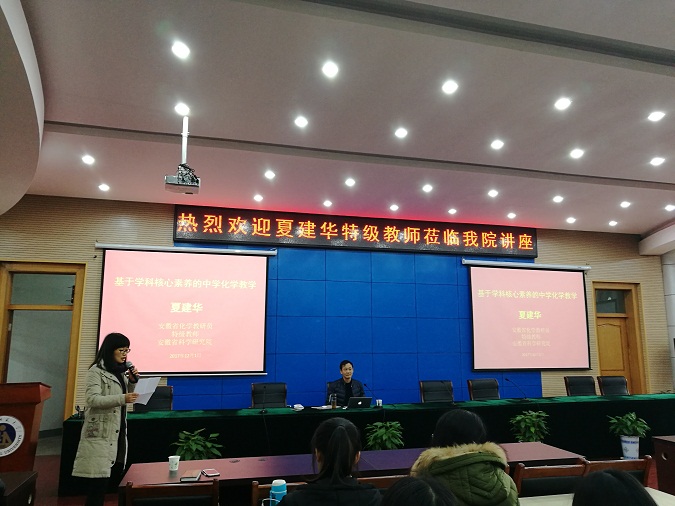 2017年12月1日下午,教育部基础教育课程教材专家委员会委员、安徽省教育科学研究院课改办主任,中学化学特级教师夏建华老师应邀来安徽师范大学作题为《基于学科核心素养的中学化学教学》专题学术报告。报告会在安师大花津校区圆形会议中心举行,由化学系主任阚显文教授主持,2015、2016级化学专业师范生、化学教学论专业研究生及部分老师参加了此次报告会。