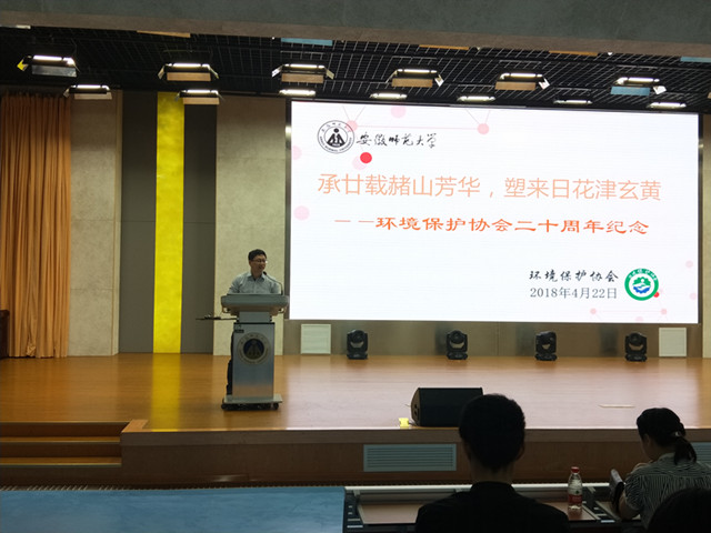 庆典活动在热情洋溢的开场舞中拉开了序幕,随后,众人一起观看了各高校兄弟社团录制的祝福环协二十周年生日快乐的视频,一句句暖心祝福,温暖了整个礼堂。紧接着,根据协会特色活动“绿色使者大赛”自编自导自演的舞台话剧《变形记之爱在远方》倾情上演,一幕幕情景再现,一幅幅感人画面让人记忆犹新,更是将协会的青春活力淋漓尽致的呈现给现场观众。精彩的演出之后,便是现任会长金思雨、前任会长张君良以及第六届会长后萍上台发言,他们给我们带来了与环协的故事,分享了协会的感动,诉说了协会的成长,真诚的话语深深的打动了在场的每一位环协人。紧接着是陪伴环协走过20年青春岁月的宫世国老师发言,20年的坚守,20年的指导,20年的见证,宫老师总结了20年来环协取得的优秀成绩,他指出,协会的发展离不开校院级领导老师的支持,离不开各兄弟组织的帮扶,离不开广大会员们的喜爱,希望协会紧紧围绕发展的宗旨继续努力。最后,化材学院副院长张小俊老师上台致辞,他首先代表学院表达了对环协20周年庆典的深深祝福,对协会二十年来取得的优异成绩给予了充分肯定,为协会的发展提出了宝贵意见和建议,并预祝环协二十周年庆典圆满成功。