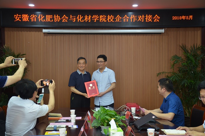 分别与安徽化肥工业协会、安徽省金正大生物科技公司、安徽省华谊化工公司签订了校企合作协议,并向与会企业家颁发就业创业指导师聘书。