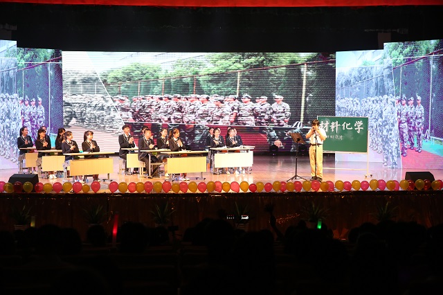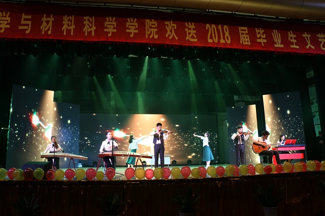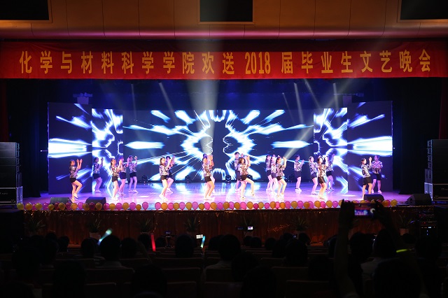 芳华如诗,青春正好,荣菁秋、盛梦婷等同学带来的歌曲串烧《芳华》用经典的旋律描述了青春的诗和远方。五月栀子留白,六月你我离散,由学生会综艺队推送的情景剧《栀子花开》绘出了一幅缤纷的生活画卷,用大学生活的点点滴滴勾起了毕业生的离别思绪。紧接着教职工合唱《国家》更是激起了同学们的家国情怀,表达了学院教师对毕业生投身报国的殷切期望。舞动奇迹、秀出活力,由任杨、孟靖洁等同学带来的舞蹈串烧展现了化材学子的青春激情,动感的舞姿把晚会又推向高潮。