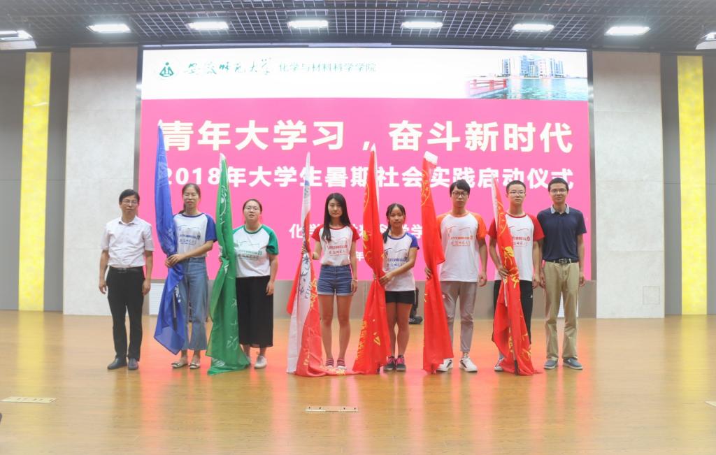 仪式上进行了优秀队长结队帮扶队旗交接。2016级化学师范专业黄月带领全体志愿者们进行集体出征宣誓。与会领导老师分别为校院两级重点团队授旗。队长们高举飘扬的队旗,吹响了今年社会实践出征的号角。仪式最后,学院党委副书记余妍霞向全体队员做了出征动员讲话,她充分肯定了社会实践第三课堂的育人功能,她希望全体队员要在实践中“养成高尚品格”、“练就过硬本领”、“自觉奉献青春”。仪式在嘹亮的安徽师范大学校歌中拉下帷幕。领导们与社会实践队长们合影留念。至此,化材学子投身实践,奋进新时代的号角已全面吹响。