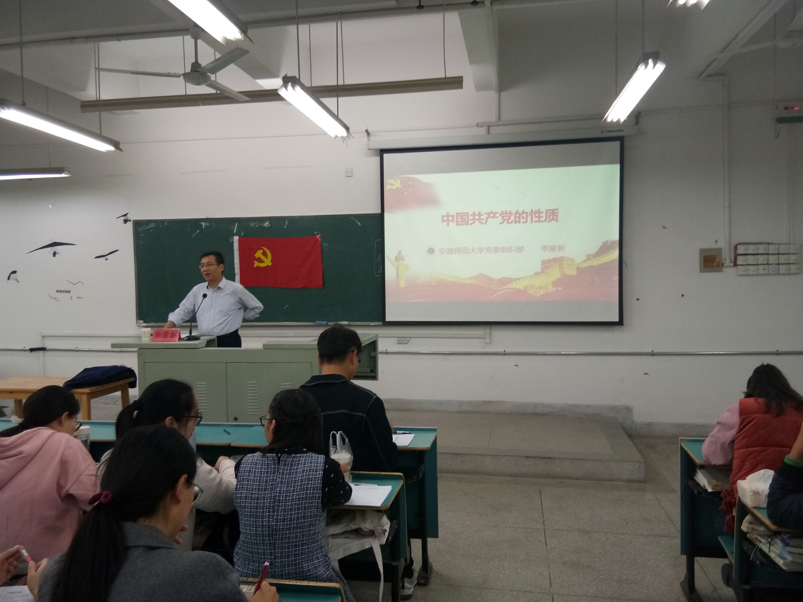 分党校第25期入党积极分子培训班理论课第三讲,在行知楼2070101教室如期举行。安徽师范大学党委组织部部长季爱新应邀为本院入党积极分子培训班学员进行了“中国共产党的性质”专题授课。