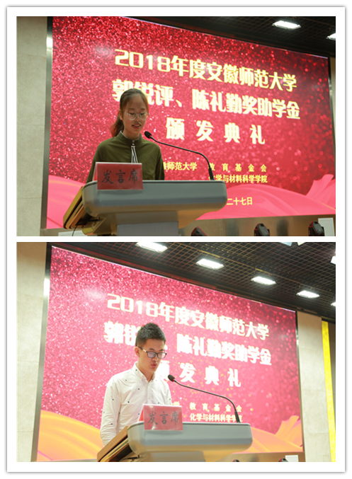 颁发典礼在嘹亮的国歌声中拉开了序幕。校教育基金会项目管理部部长郑金泽宣读了颁发郭锐评、陈礼勤奖助学金的决定。随后,陈礼勤和各位领导分批次向获奖、受助学生颁发奖助学金并合影留念。2016级化学师范专业王慧同学及2017级化工专业吴飞同学分别代表获奖、受助同学发言,两位同学分别表达了对郭锐评女士、陈礼勤博士的无私资助表达了深深的敬意,对学校、学院的关心表达了深深的谢意。两位同学表示郭锐评、陈礼勤奖助学金的设立给不仅给带来了物质上的奖励和帮助,更是精神上的鼓励和支持,郭锐评女士、陈礼勤博士克服重重困难,勇于创业的奋斗精神更是激励广大学子能够更加努力更加拼搏,两位同学都表达了要以更加优异成绩来感谢郭锐评女士、陈礼勤博士及学校学院给予的无私关怀与帮助,以青春之我,奉献青春之国家、青春之民族,也以青春之力为90岁师大添砖加瓦。