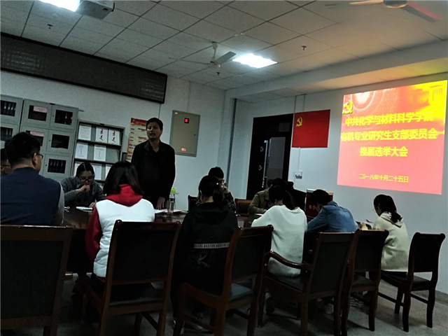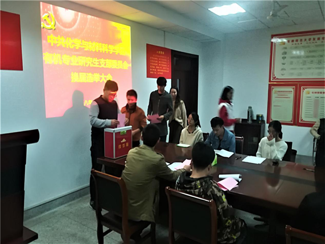 有机专业研究生党支部委员会换届选举大会在花津校区礼勤楼707会议室举行。支部共27名正式党员,3名预备党员。出席会议的有学院党委委员、副院长周双六,25名正式党员,3名预备党员。会议由支部书记杨培俊主持。