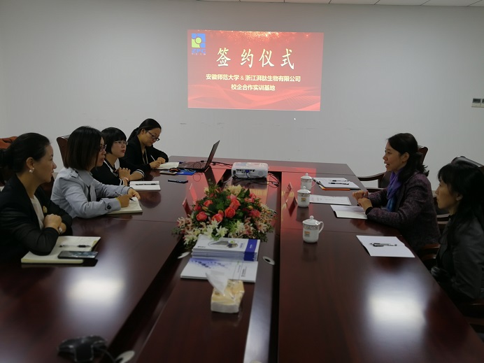 11月15日,余妍霞一行首先来到浙江湃肽生物有限公司的研发中心杭州分部参观考察,浙江湃肽生物有限公司销售总监、我校2011届校友孟凡玲热情接待了余妍霞一行。随后考察团一行驱车赴绍兴浙江湃肽生物有限公司总部洽谈校企合作事宜。交流中,余妍霞向公司详细介绍了学院的专业设置、学科特色和人才培养状况等。浙江湃肽生物有限公司董事长刑海英详细介绍了公司的基本情况及经营理念,双方就未来校企合作,特别是大学生专业实习就业基地建立和校园人才招聘等共同感兴趣的话题进行了深入的交流与探讨。随后,双方举行合作共建实习就业基地签约挂牌仪式。余妍霞与刑海英分别代表学院与公司就合作共建大学生专业实习和就业基地签约授牌。