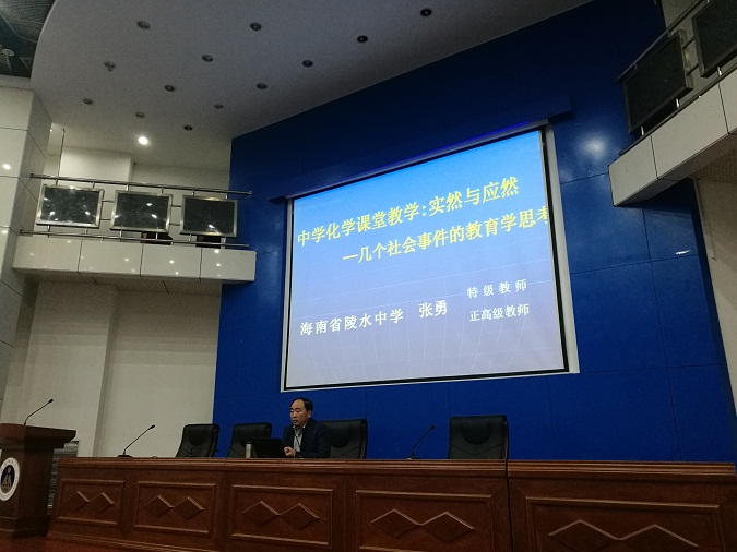 张勇校长做了题为“中学化学课堂教学:应然与实然”的专题学术报告。张校长以几个社会事件为切入点,引入报告主题。整个报告分为课堂文化建构、问题解决路径以及心理结构与表征三部分。首先张校长以自身的生活经历引入化学课堂教学中的问题,继而提出了“教育要走向文化,使每个人成为有品位的人”的观点。同时,张老师从教学理念与教育价值方面阐述了如何在课堂中更好地促进化学知识教学。最后,张老师以布鲁姆的目标分类理论为依据,对当前课堂教学实施现状发表了自己的观点,阐述了中国学生应该如何发展核心素养。报告会后张老师与在场师生进行了交流互动,耐心解答了大家的问题。