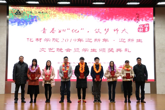 在理科大楼报告厅隆重举办“青春如‘化’,筑梦师大”2019年“迎新年·迎新生”暨2018年度学生颁奖典礼。学院班子成员、首届最美教师朱昌青老师、教授委员会副主任倪永红老师、化学系主任阚显文老师、材化系主任王正华老师、全体辅导员以及全院新生参加了颁奖典礼,同学们在榜样典型中感受喜悦和鼓舞。
