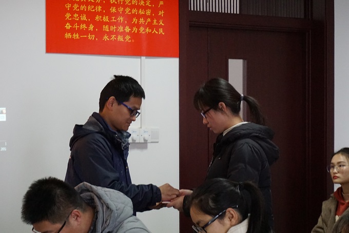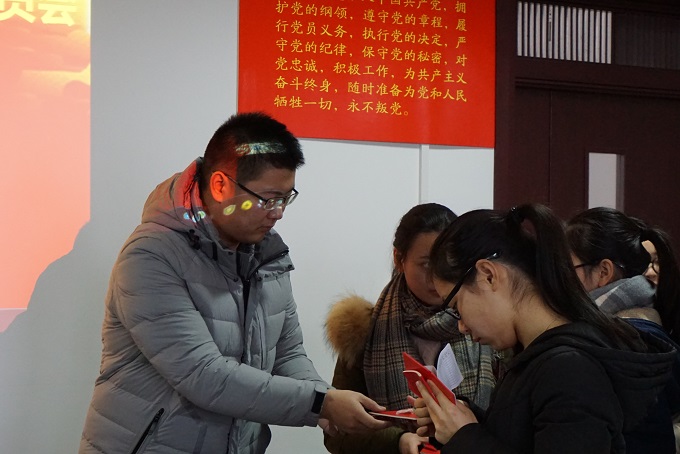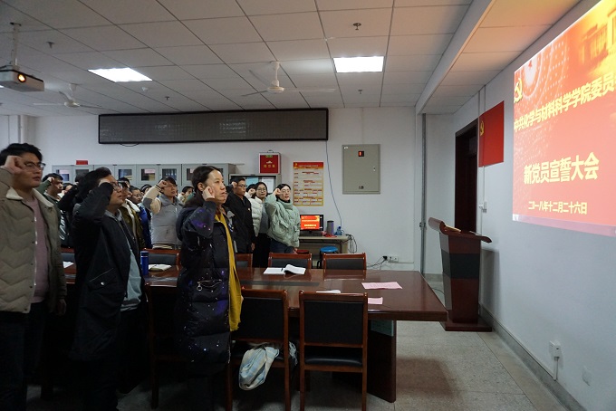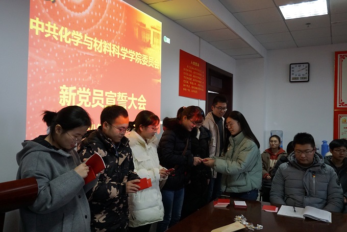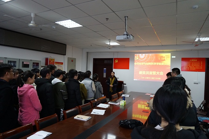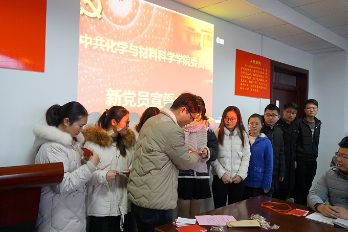 首先,全体起立,奏唱中华人民共和国国歌,学院党委副书记余妍霞代表学院党委宣读了同意47位同志发展为中共预备党员的决定。党支部书记向新党员佩戴党员党徽、发放《中国共产党章程》和《党费证》。新发展党员现场关注了共产党员、安徽先锋网、安徽纪检监察等公众微信号。全体党员在材化系本科生党支部书记陈露老师的带领下进行入党宣誓:“我志愿加入中国共产党,拥护党的纲领,遵守党的章程,履行党员义务,执行党的决定,严守党的纪律,保守党的秘密,对党忠诚,积极工作,为共产主义奋斗终身,随时准备为党和人民牺牲一切,永不叛党。” 宣誓过程庄严凝重,全体党员声声震彻的入党誓词代表了他们对党最忠诚的决心。新党员代表杨帆做了表态发言,决心在今后的工作中将始终牢记自己是一名共产党员,用自己的实际行动和人格力量,践行社会主义核心价值观,做履职尽责的合格党员,为党旗增辉。