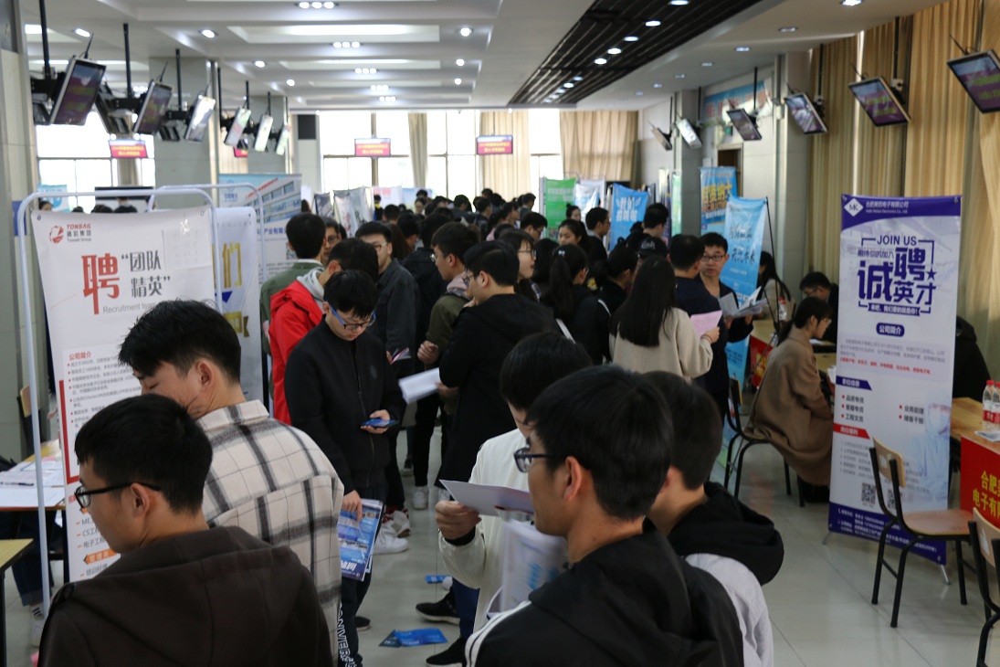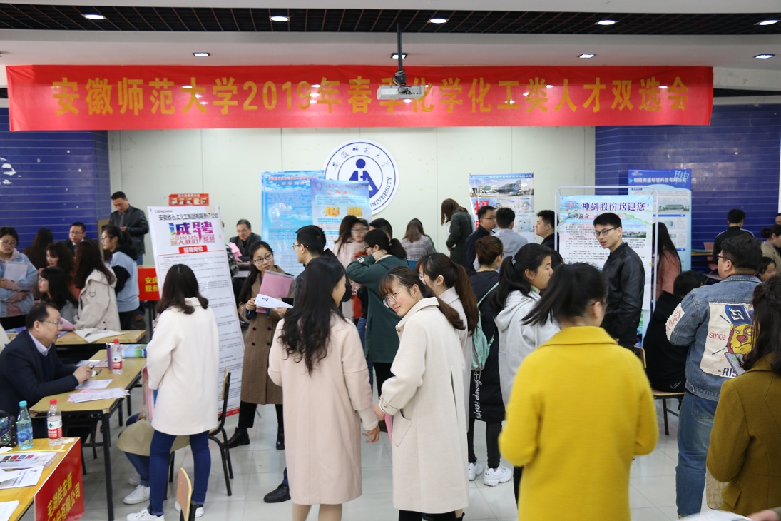 联合主办,合肥新站高新区人社局、安徽省化工学会和安徽省化肥工业协会协办的安徽师范大学2019年春季化学化工类人才双选会在大学生活动中心二楼招聘大厅拉开帷幕。本次活动吸引了省内外近90家用人单位齐聚校园,为化学化工类、电子自动化类等专业毕业生提供了1185个就业岗位,双选会现场气氛热烈、秩序井然。