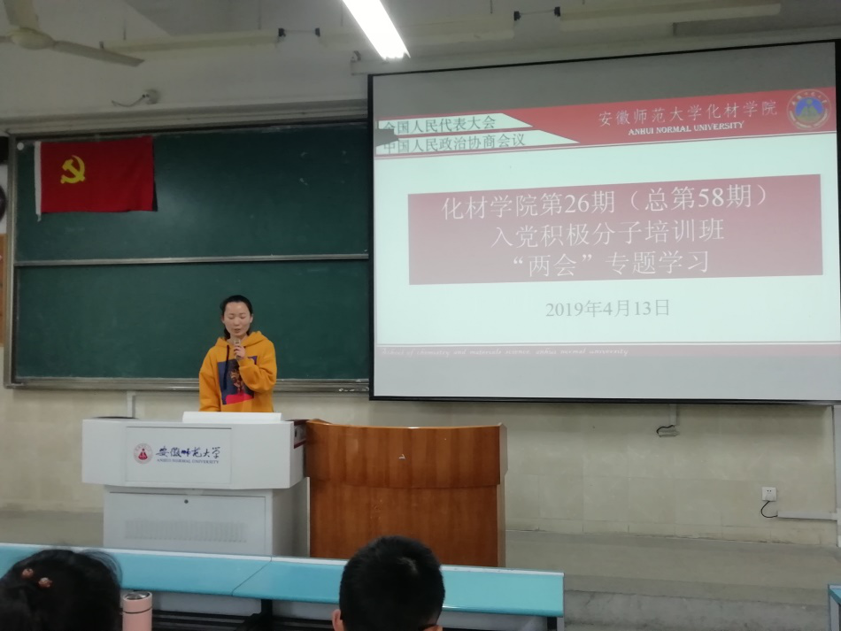 分党校第26期入党积极分子培训班第一次实践活动,在行知楼2010303教室如期举行。第26期党校班班长,2017级应用化学专业王紫薇带来全体学员进行了“两会专题学习”主题学习活动。