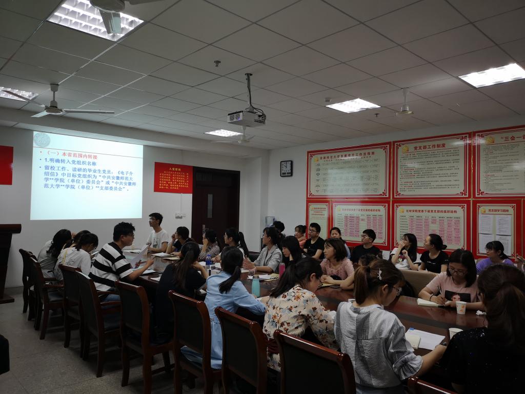 会后,应化系本科生党支部在化学楼707党员活动室召开毕业生党员组织生活会。会上,支部书记陶勇老师首先带领大家学习了中共安徽师范大学委员会组织部下发的《关于做好2019届毕业生党员教育管理及组织关系转移工作通知》的文件精神,强调了本次会议的重要性。针对关于做好毕业生党员档案归档问题做了详细的说明和解释。对于毕业生党员组织关系的转移问题,分别从从本省内转接、全国范围内转接进行了详细的说明,会上统计了各位毕业班党员同志的未来去向,明确了支部内各位党员的组织关系交接。