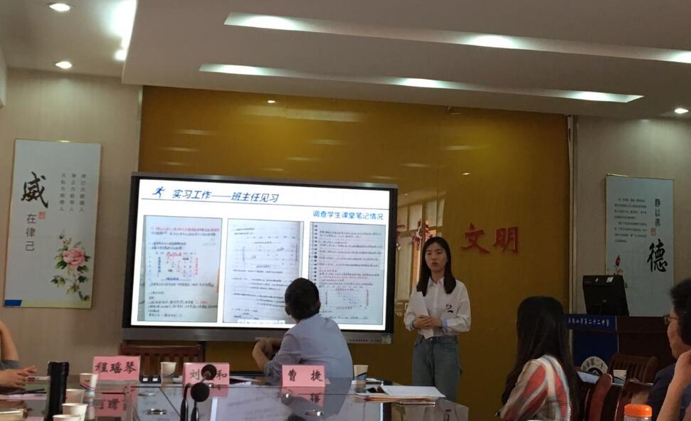 实习生代表16级化学专业程瑾同学就近两个月的实习工作进行了汇报和交流,她从化学课堂教学、班主任工作、特色活动及收获与成长等几个方面,图文并茂、生动详实地向与会领导老师展示了他们丰富多彩的教育实习工作。实习的同学们一致认为在二十二中的教育实习对锻炼他们的教学技能,提高教学水平十分有益,在指导老师的帮助下成长非常迅速,收获非常多。