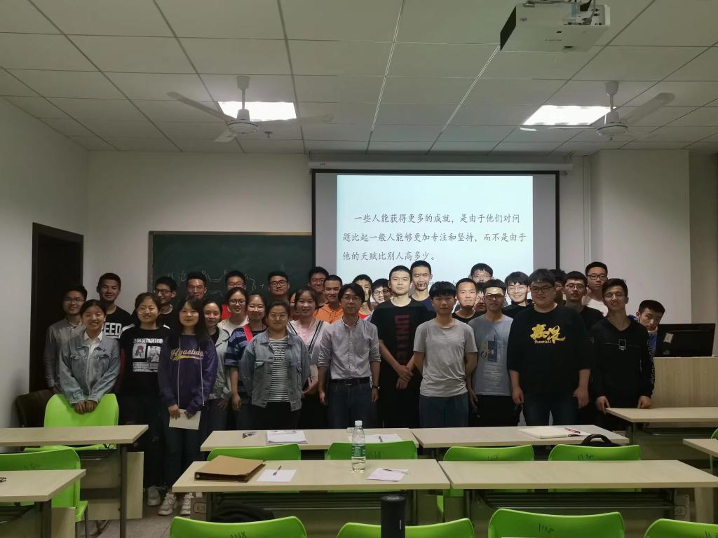 第二部分崔鹏老师总结了自己一路成长的感悟以及给予同学们的一些建议,主要从以下六个方面展开。一是“在学习中发掘兴趣”,不要急躁于明确自己的方向,了解前沿化学知识,善于捕捉课堂上老师所说的重点;二是“对Science保持好奇心”,崔老师简要介绍了有机化学史,以及一些著名的化学家;三是“人都是训练出来的”,崔老师强调同学们要严格要求自己,激发自己的潜能;四是“尽可能push自己的极限”,确立一个远大的目标;五是“培养写作能力”,在今后的学习生涯中,我们常常会写作,这就需要同学们有意识的去培养;六是“Deadline意识”,给自己一个底线,确保自己的学习效率。崔老师说,化学学习过程中,可能只有5%的快乐,但是“要让5%的快乐大于95%的不快乐”,那么就有了继续学习的动力。活动的最后,崔鹏老师与同学们合影留念,活动圆满结束。