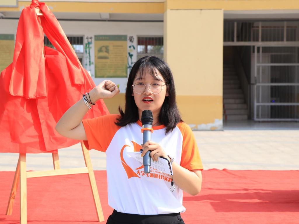 上午八点半,揭牌仪式在庄严肃穆的升旗仪式中开始,随后实践团队队长陈霞带领全体队员进行国旗下宣誓,号召当代大学生积极为青春“三下乡”奉献自己的一份力量。志愿者代表郭晶晶从自己参加支教活动的初心发出,深情讲述了通过支教如何使自己历练成了一名勇担时代使命的新时代青年大学生。虽然烈日炎炎,但每一个人都在认真聆听。