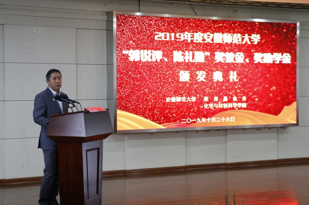 颁奖典礼在庄严的国歌声中拉开序幕。活动伊始,校教育基金会项目管理部部长郑金泽宣读了2019年颁发“郭锐评、陈礼勤”奖教金、奖助学金的颁发决定。随后,陈礼勤、毕明福和现场嘉宾分批次向获奖教师、获奖受助学生颁发奖教金和奖助学金。2017级化学师范专业陈霞同学及2018级材料化学专业曹梅同学分别代表获奖、受助同学发言,两位同学对郭锐评女士、陈礼勤博士的无私资助表达了诚挚的感激,并向学校、学院的关心表达了深深的谢意。她们表示郭锐评、陈礼勤奖助学金的设立不仅在物质上给他们带来了帮助,更让他们在精神上感受到鼓励和支持,他们将会用更加优异成绩来回报郭锐评女士、陈礼勤博士及学校学院给予的关心和帮助。
