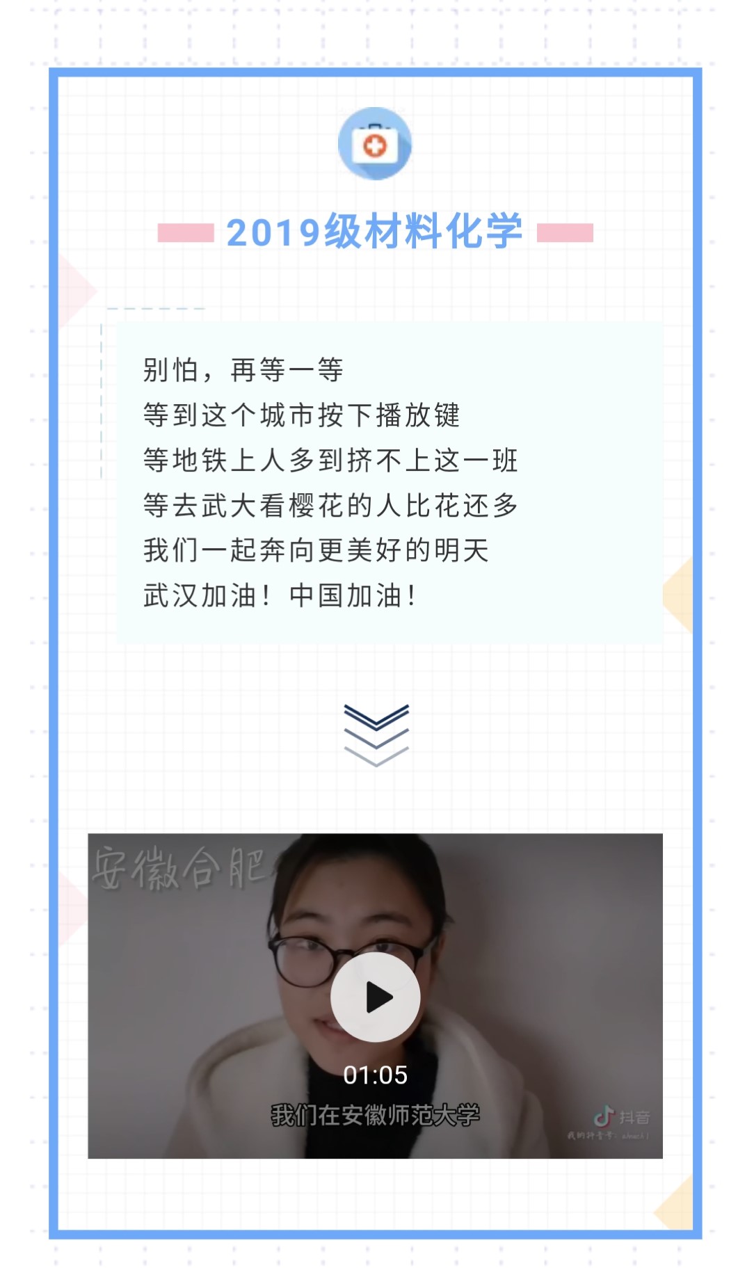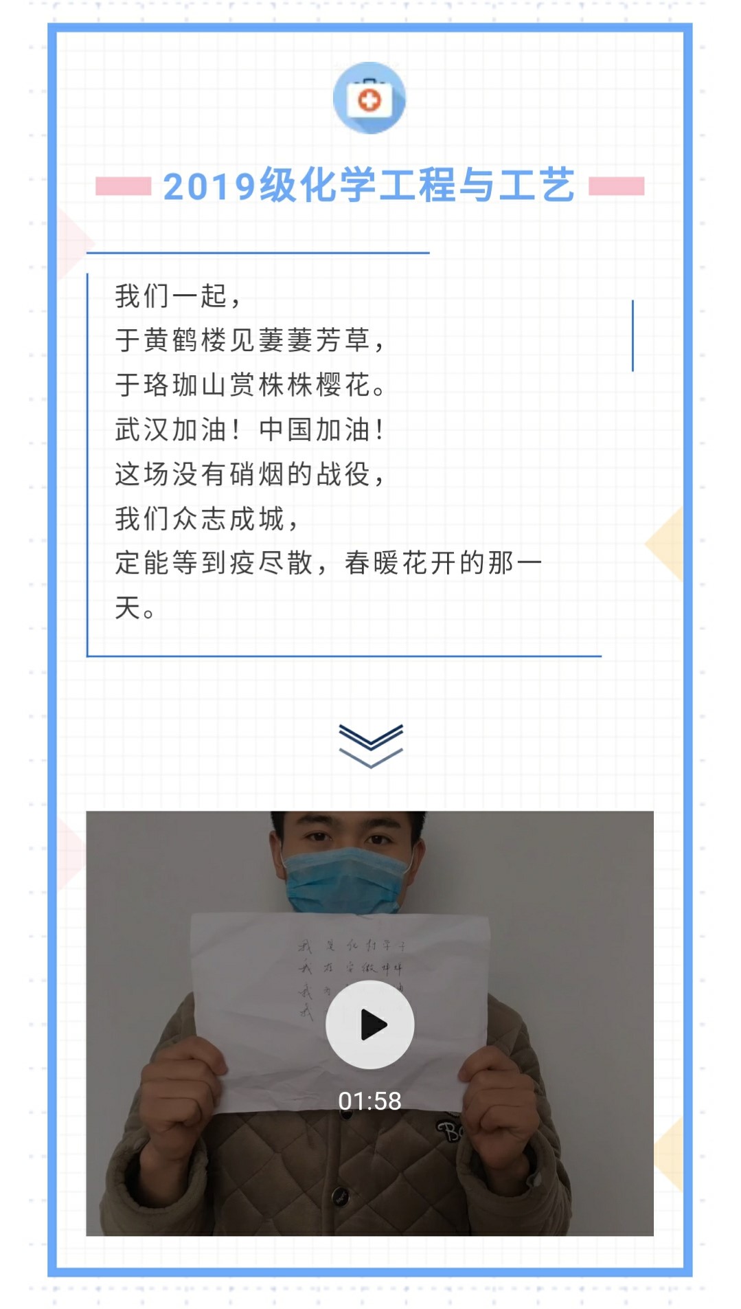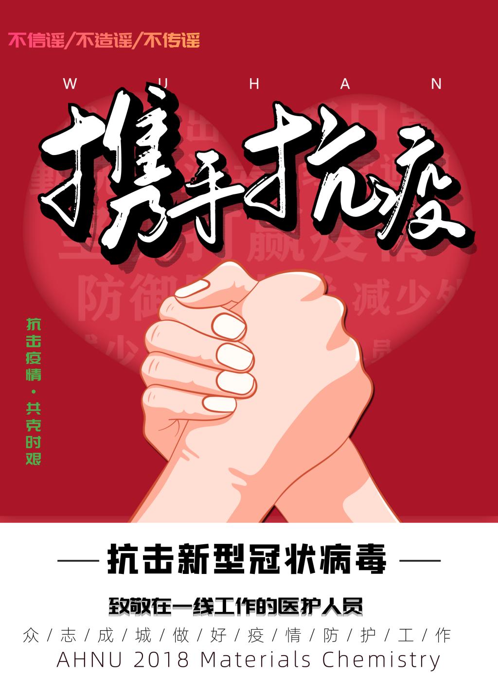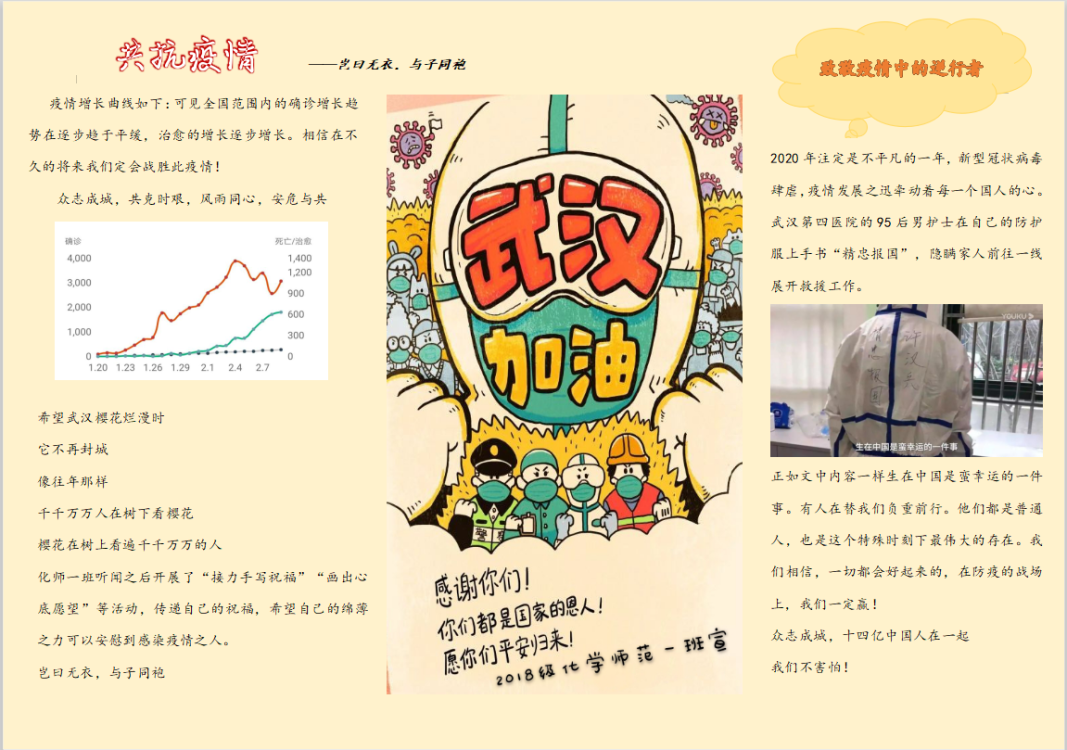 轻触笔尖以“艺”抗疫,化材学子携手共战。在抗击新冠肺炎疫情的战役中,化材学子虽不能冲上一线与病毒抗争,但始终心系前方疫情。我院积极发动青年先锋,以班级为单位,为武汉传递爱与温暖。青年学子全员行动,用手写文字传递祝福,共克时艰;用海报的形式礼赞英雄,传达敬意;用电子“微板报”形式宣传疫情知识,提高认识;用自制视频的形式传递满满正能量,为武汉加油。抗击疫情你我共行,防疫攻坚众志成城。大家随身处各地,但心系一处,相信病与伤痛终将逝去,企盼共迎春暖花开。