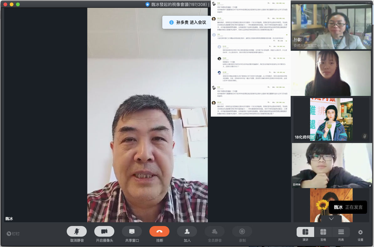 孙影副教授主持,2017级、2018级化学专业师范生、化学教学论专业研究生及部分化学教学论专业教师共两百余人线上聆听了此次报告。