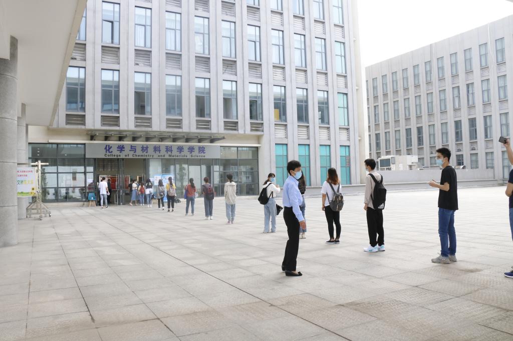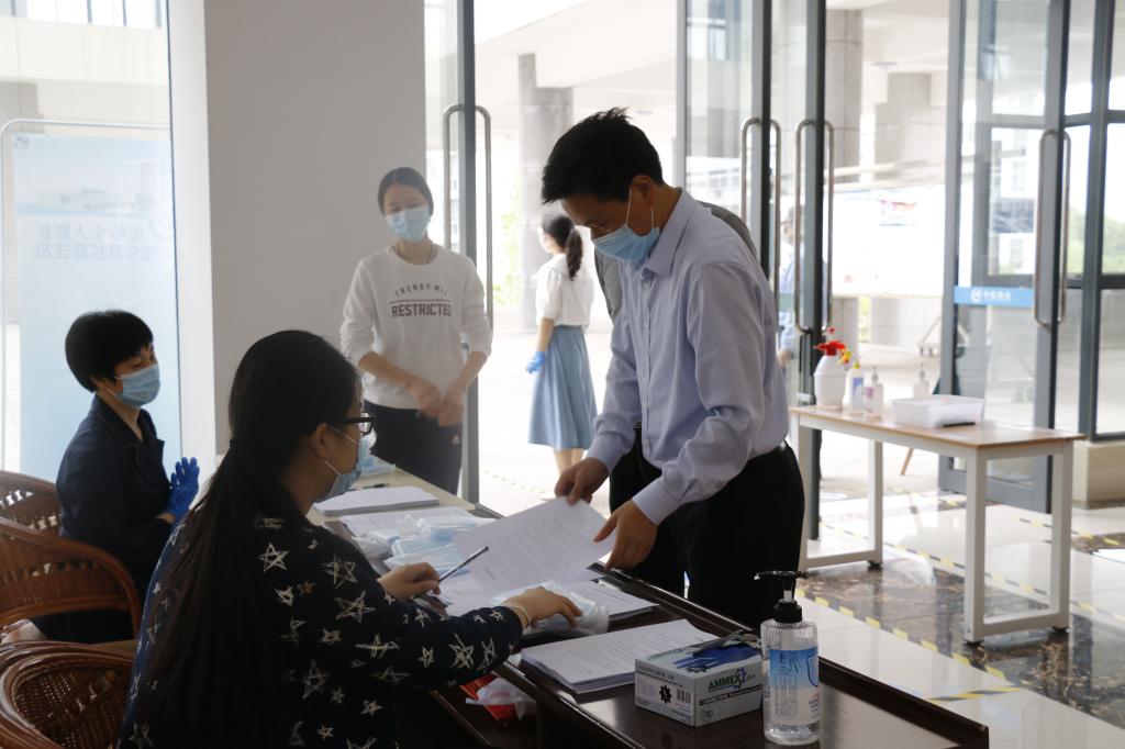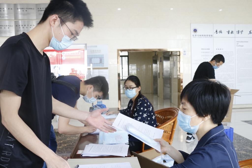 5月16日上午,学院在礼勤楼二楼大厅设学院报到处,分年级、分时段安排返校学生进大楼实验室。地面张贴1米间隔线,对报到学生测体温、检查有无戴口罩、签订健康承诺书,给每位同学发放口罩,以实验室为单位发放消毒液。学院领导和研究生辅导员现场提醒学生注意自我防护,温馨讲解返校管理要求。副校长毕明福莅临报到现场实地调研指导学生报到工作,详细了解当天报到情况及学院具体安排,走访实验室查看消杀情况,叮嘱师生一定要高度重视疫情防控工作,做好个人防护,确保返校后师生身体健康、校园安全稳定、教育教学有序。