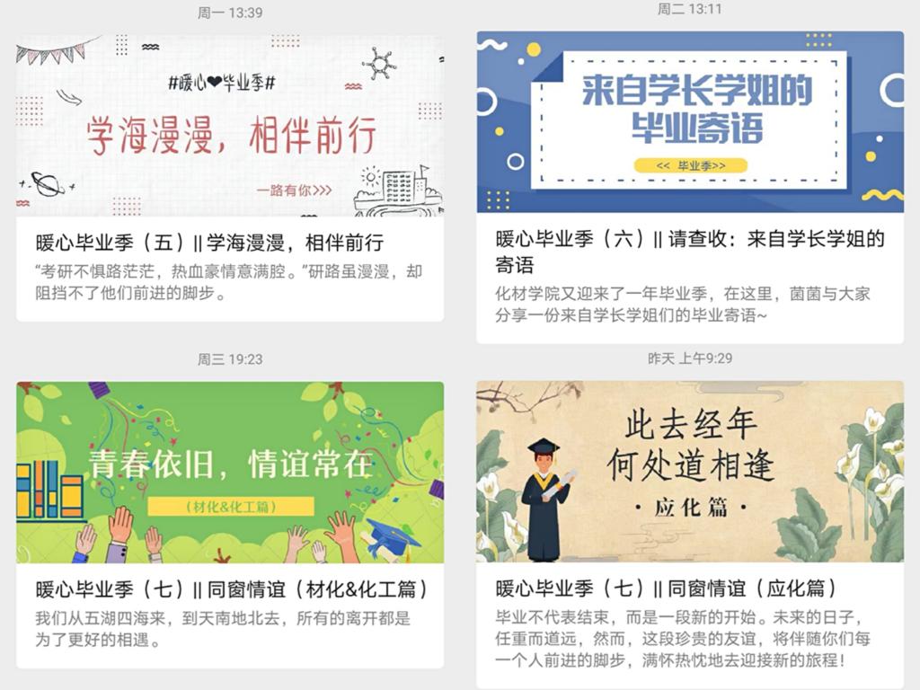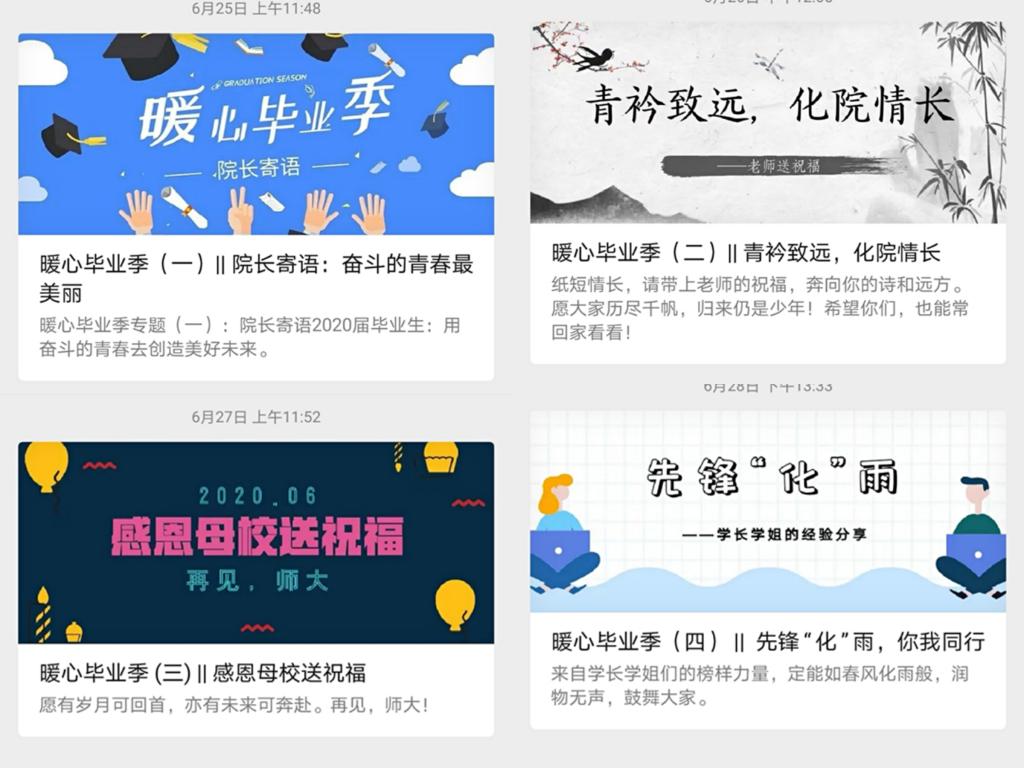 毕业生返校前,学院利用QQ和微信公众号等新媒体营造热烈浓厚的毕业生离校氛围。6月25日开始举办了“暖心毕业季”系列线上欢送毕业生活动:院长寄语、师生祝福、党员先锋成长故事、学霸寝室养成记、同窗话别毕业生视频,为全体毕业生送上了最真挚、最炙热的临别祝福,引导毕业生在全民抗“疫”中情系母校、心怀感恩、不忘初心、砥砺前行。
