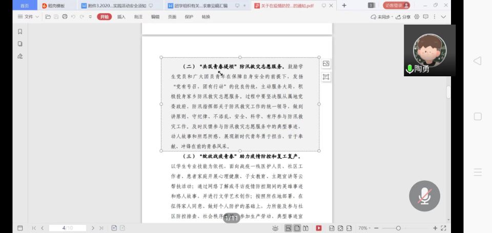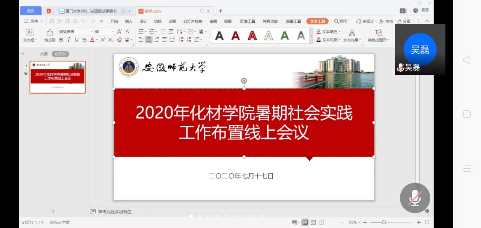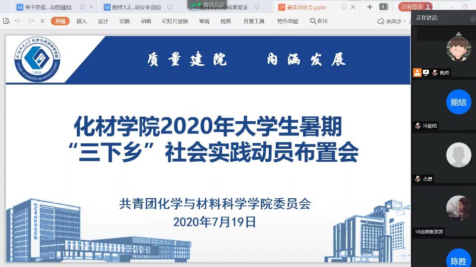 深入开展筹备工作,扎实推进任务分配。为引导化材学子顺利开展暑期社会实践活动,院团委书记陶勇带领各学生组织负责人于线上开展了暑期社会实践工作布置会。会上,陶勇老师带领学生干部仔细阅读了关于2020年大学生暑期“三下乡”社会实践活动通知以及任务工作简明表,让学生精确了解了暑期实践开展过程中各组织部门的工作任务,为接下来的暑期实践做好充足的工作准备。