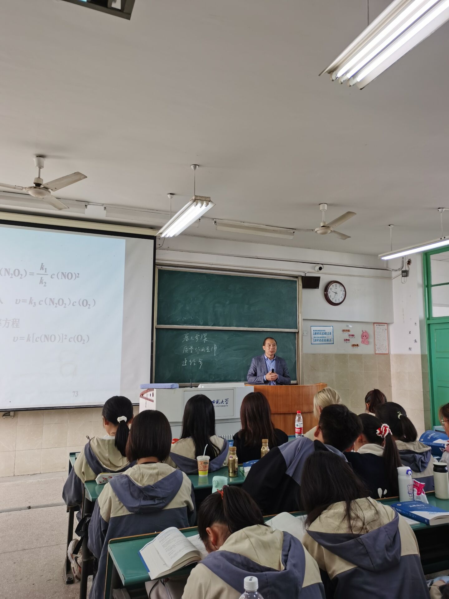 王正华老师首先通过几个常见的化学反应式带领我们解读了书中对于化学反应速率定义的阐述。化学反应速率是指在一定条件下,反应物转变为生成物的速率,经常用单位时间内反应物浓度的减少或生成物浓度的增加来表示。接着由乙酸乙酯的皂化反应引出平均反应速率这一概念,并通过作图法和数学求极限的方法,条理清晰地导出瞬时反应速率的定义式,还着重强调了起始反应速率对研究瞬时反应速率的重要性。不仅如此,王正华老师还带着同学们一起通过作图寻找瞬时反应速率的变化规律,并发现了反应物速率和反应物浓度具有一定关系,由此得出速率方程。课上,老师还细致地教导同学们如何解答课后习题。同学们受益匪浅。