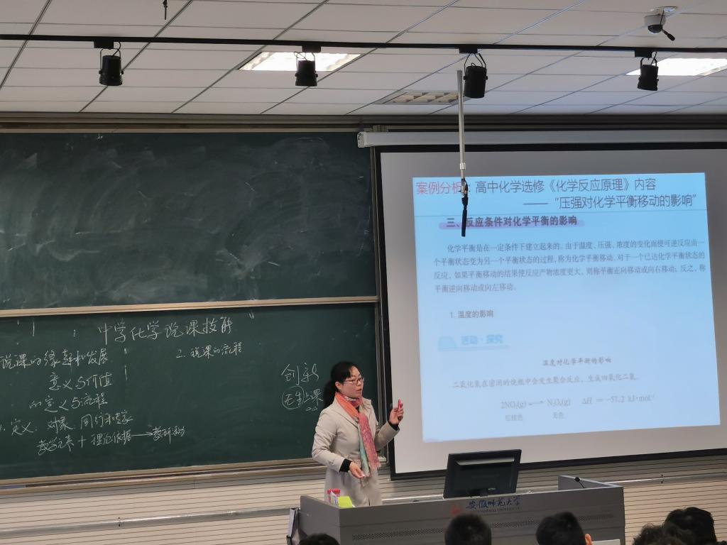 孙影老师为2018级化学师范专业本科生开展了“中学化学说课技能”的专题教学。学校教务处领导、校教学督导团、学院领导、学院督导组和部分中青年参加了本次观摩活动。