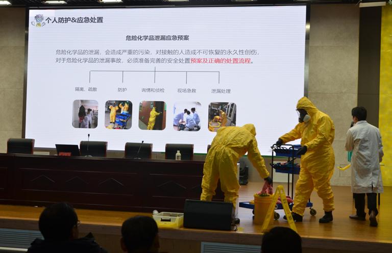 活动开始,翟永志老师从近年来发生的安全事故实例入手,结合高校接连发生的惨烈的实验安全事故,分析导致实验室安全事故的多种因素,指出了构建实验室安全防控保障体系的重要性和必要性。随后,翟老师通过对易燃物、腐蚀性物质等实验室常见危险化学物品进行知识普及,呼吁要培养新的实验室安全价值观。最后,在学院老师和同学的配合下进行现场实操演练,对实验室事故发生的原因、进展的过程、处置的结果等进行了情景再现,并由翟老师一一讲解每一环节的注意事项和正确处理方式。