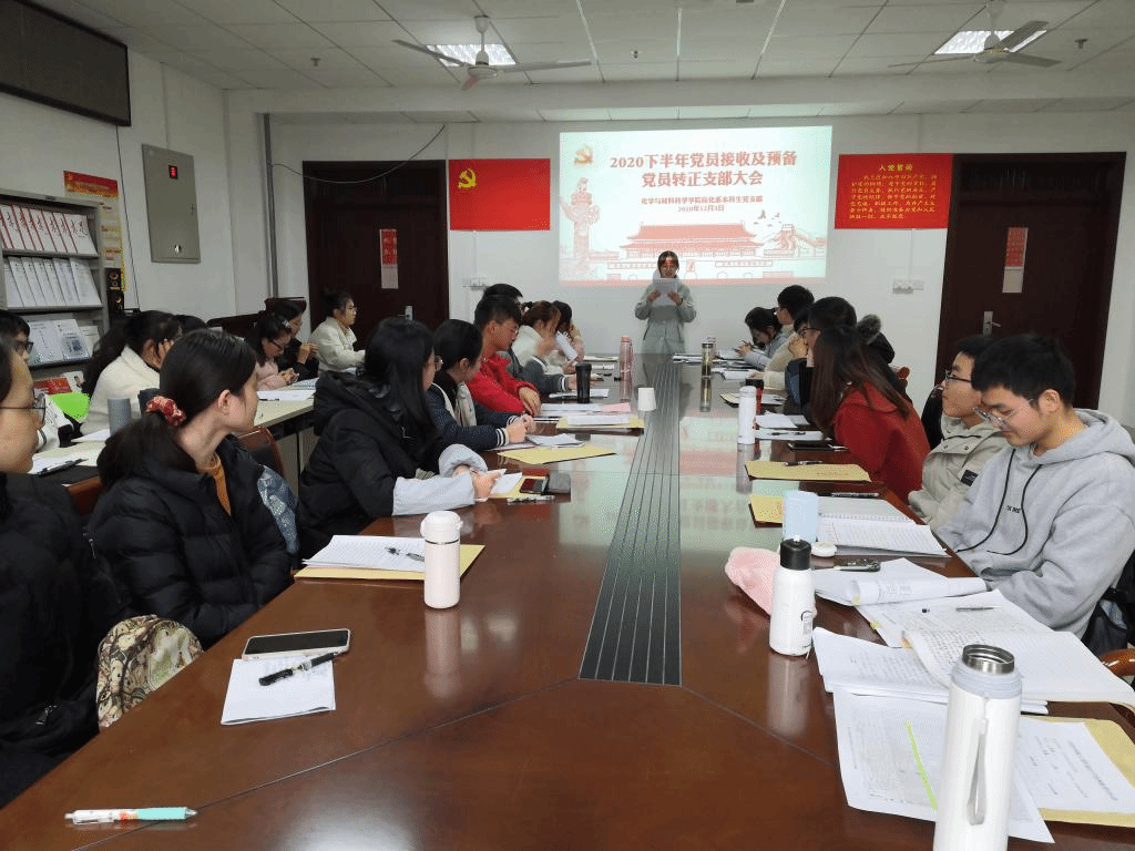 应化系本科生党支部在化材楼707会议室举行了2020下半年党员接收及预备党员转正党支部大会。化材院党委副书记余妍霞、2017级应用化学专业辅导员王芳、2020下半年发展对象级支部所有党员参加了此次支部大会。本次会议由支部书记陶勇主持。