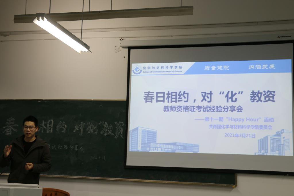 于教学楼顺利开展以“春日相约 对‘化’教资”为主题的第十一期happy hour活动。本次活动,邀请我院2018级化学师范专业的17名学生担任主讲人,向学院2019级4个非师范专业近200名学生分享教资考试的“通关秘籍”。