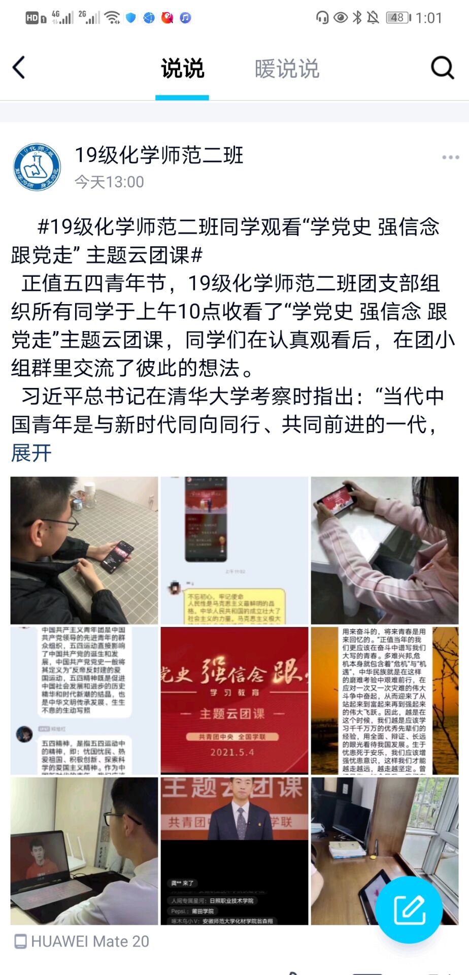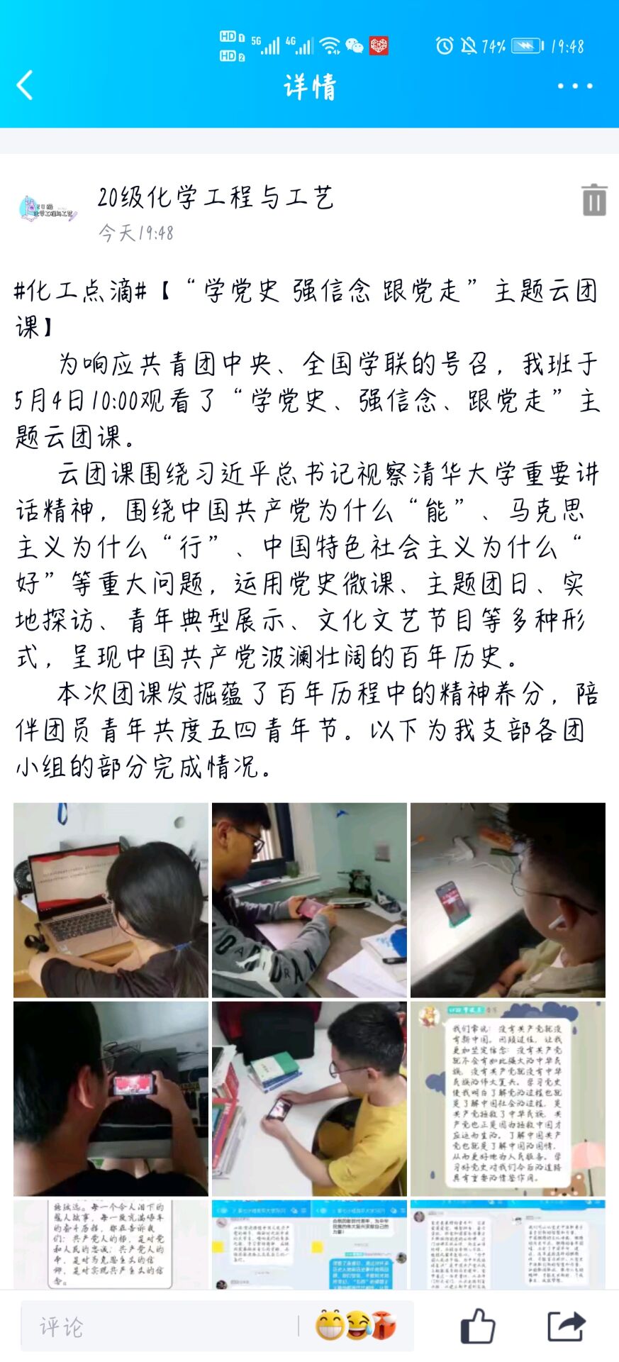 5月4日上午,各团支部团员青年利用互联网平台在线收看“学党史、强信念、跟党走”主题云团课,并组织开展线上交流。部分团支部还组织集体观看各地主题团日活动优秀案例展播,了解共青团庆祝建党100周年优秀宣传文化产品。