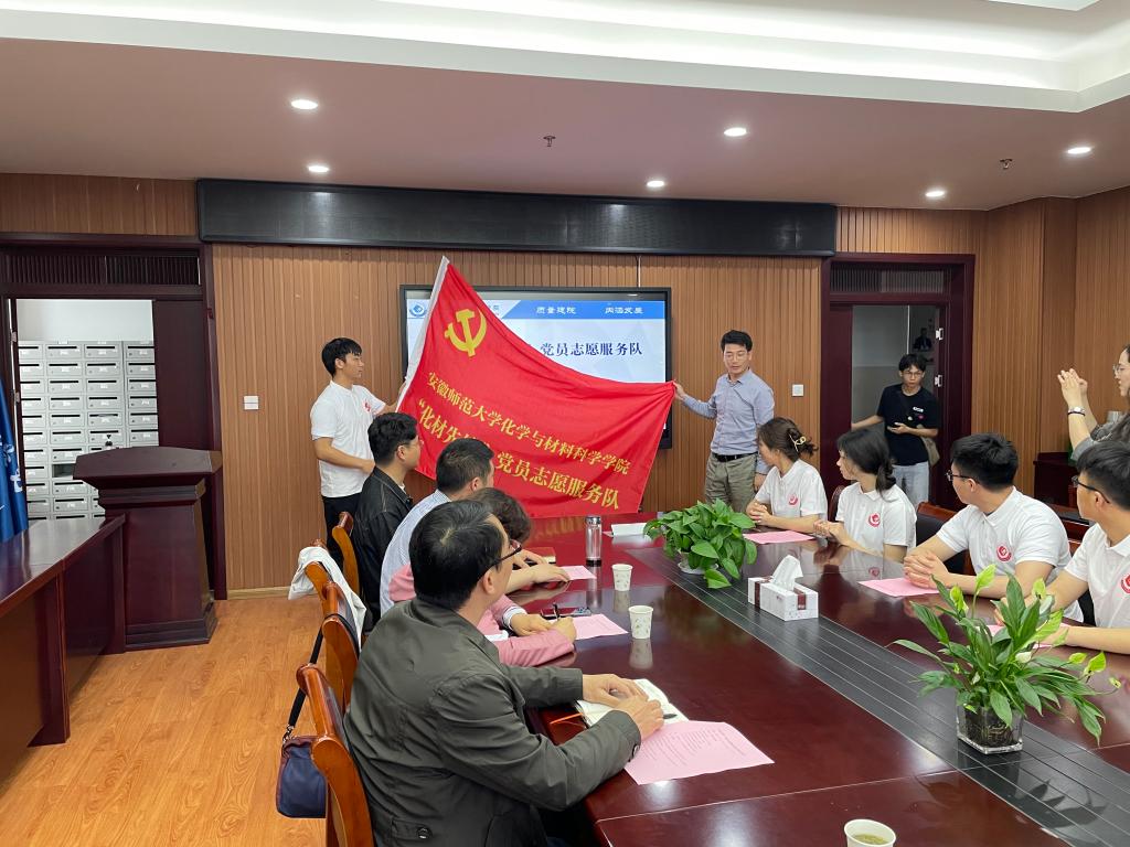 陈骁为服务队授“‘化材先锋’党员志愿服务队”队旗,勉励同学们在志愿服务中展现师大青年学子的责任与担当,践行“小我融入大我,青春献给祖国”奉献精神。段萍为服务队授“篮球比分手机