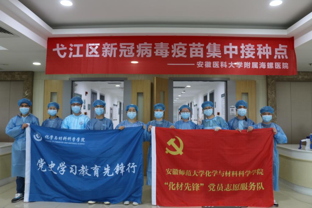 曹右林、陶勇)“您带身份证没有?您可以先手机扫码网上填报个人信息”“您最近可有服用过抗生素、饮酒?”“65岁以上老年人请走绿色通道。”“学生请以高校院系为单位排队。”……5月19日,来自安徽师范大学化学与材料学院的“化材先锋”党员志愿服务队在弋江区新冠病毒疫苗接种点——安徽医科大学附属海螺医院向每一位群众和师生说明疫苗接种注意事项、引导自觉排队、登记接种信息、解答各种疑问。