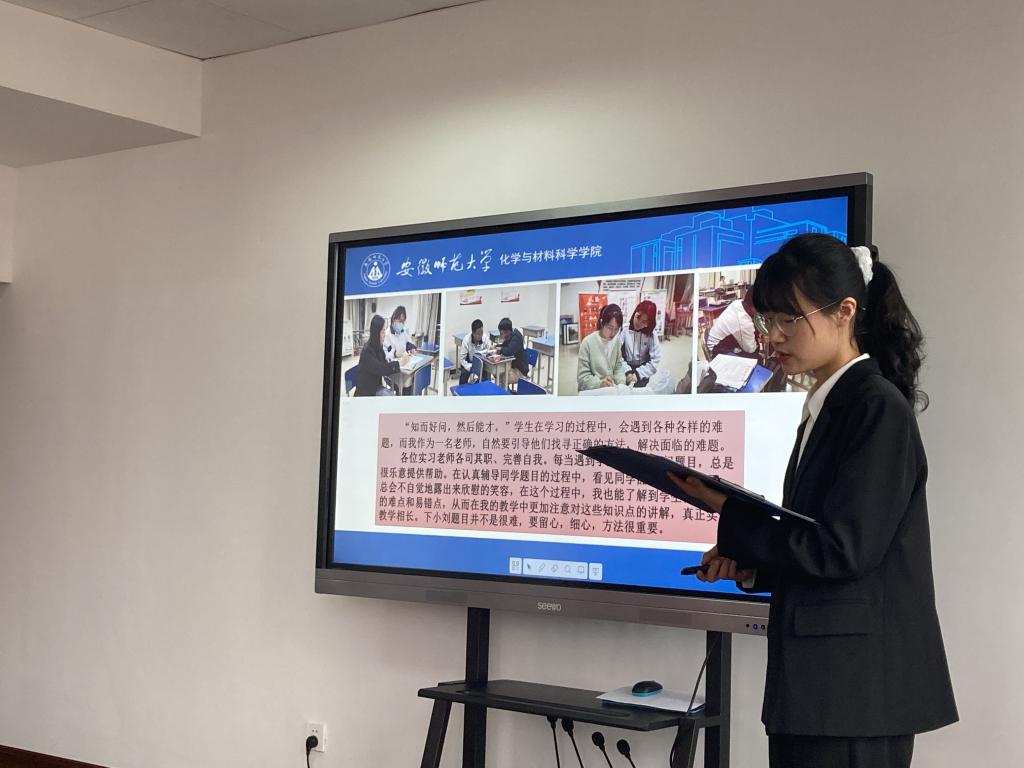 院长高峰一行来到马鞍山市第二十二中学,看望实习生,并深度参与了18化学专业实习生的实习中期成果汇报展示工作。汇报展示活动共分为实习生说课比赛、中期实习班主任工作成果汇报和教育教学实习成果展示三个部分。参与汇报及评价的还有后勇军正高级特级教师的名师工作室成员。各位老师的列席不仅使活动更加充实,也为实习工作的开展给出宝贵意见。