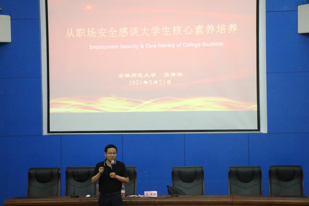 邀请社会合作处综合科科长张海兵来院作题为《从职业安全感谈大学生核心素养培养》专题辅导报告,学院党委副书记李古州、团委书记陶勇、副书记陈静、2019、2020级辅导员及学院2019级全体本科生和2020级学生骨干成员参加此次讲座。