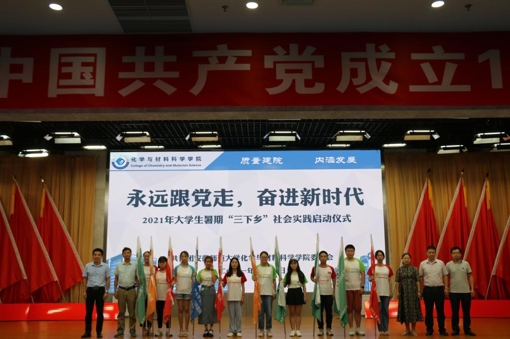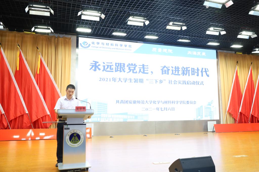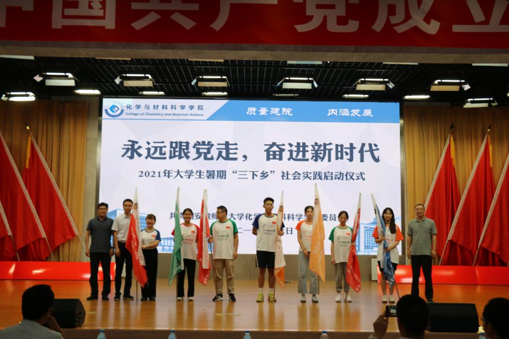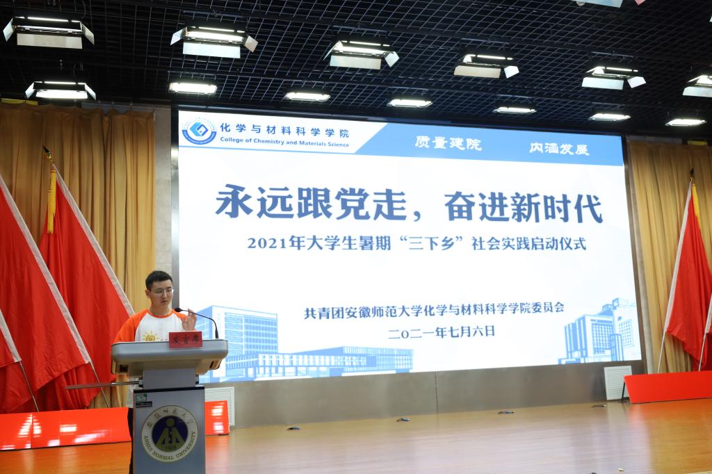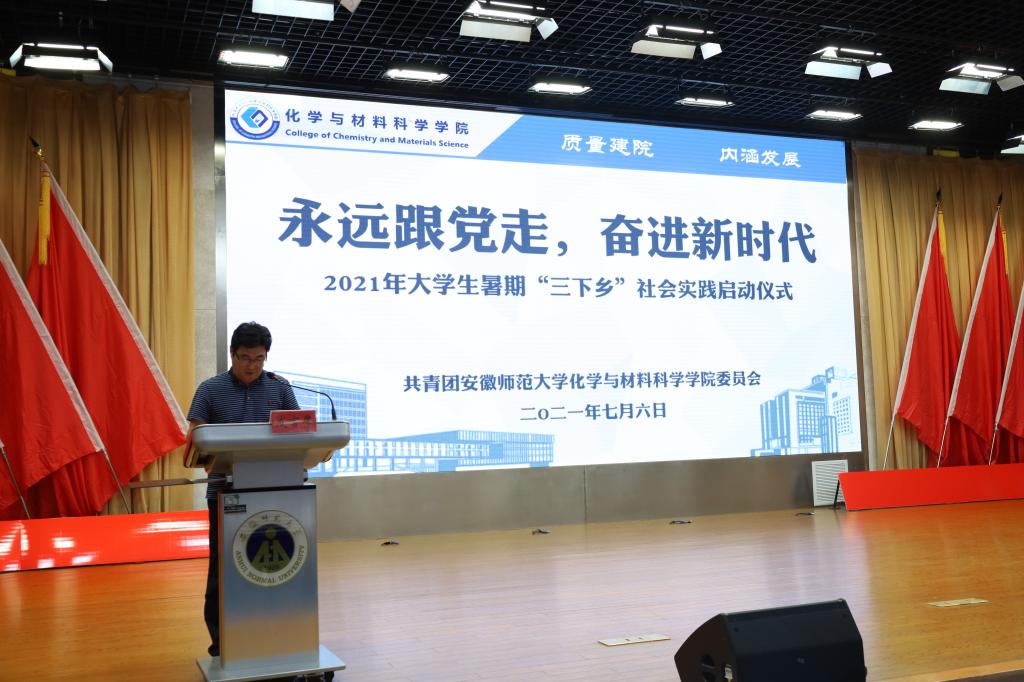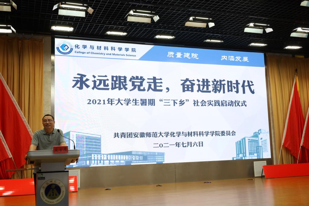 于7月6日下午15:00在理科大楼报告厅举行了2021年大学生暑期“三下乡”社会实践活动启动仪式暨授旗仪式。校团委书记汪凯、校思政课指导老师温建萍、院党委书记汪俊武、院长高峰、党委副书记李古州,副院长周双六、方臻、王波涛,系主任阙荣辉、黄玉成、周映华、指导老师代表以及学院2021年暑期社会实践全体队员参加仪式。本次会议由学院团委书记陶勇主持。