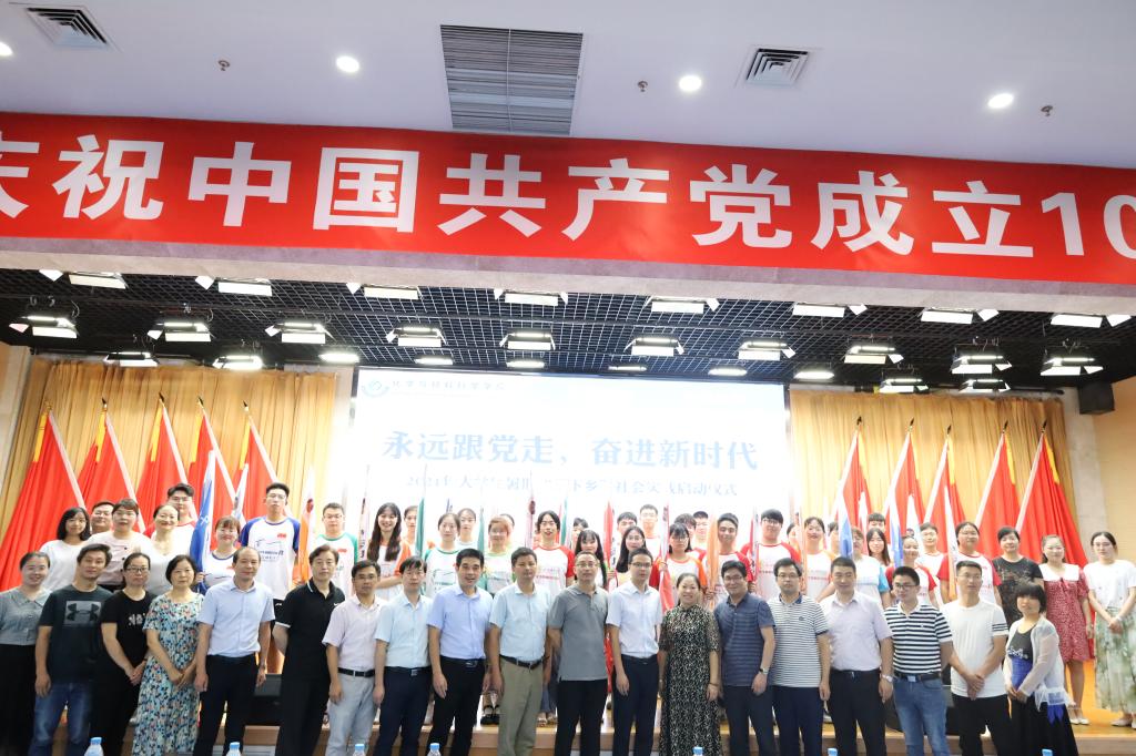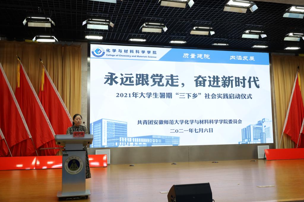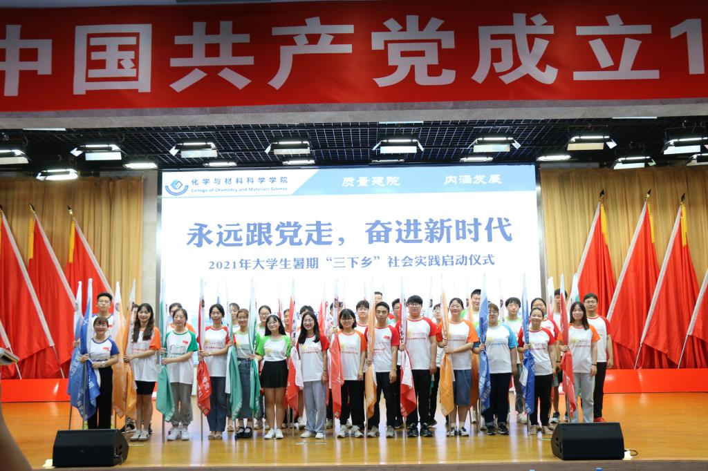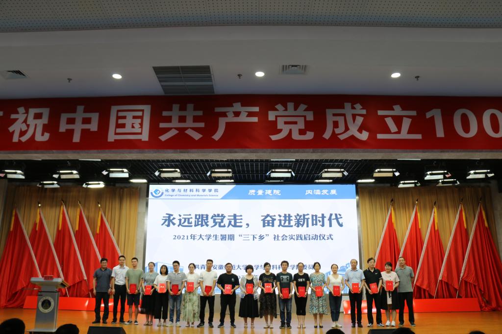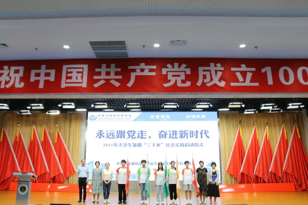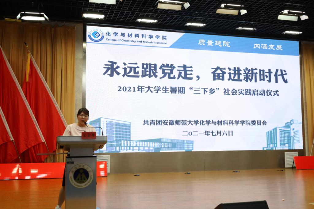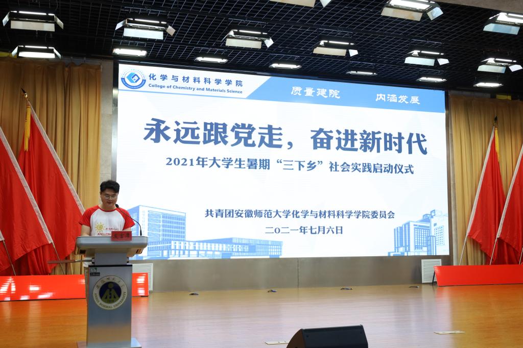 于7月6日下午15:00在理科大楼报告厅举行了2021年大学生暑期“三下乡”社会实践活动启动仪式暨授旗仪式。校团委书记汪凯、校思政课指导老师温建萍、院党委书记汪俊武、院长高峰、党委副书记李古州,副院长周双六、方臻、王波涛,系主任阙荣辉、黄玉成、周映华、指导老师代表以及学院2021年暑期社会实践全体队员参加仪式。本次会议由学院团委书记陶勇主持。