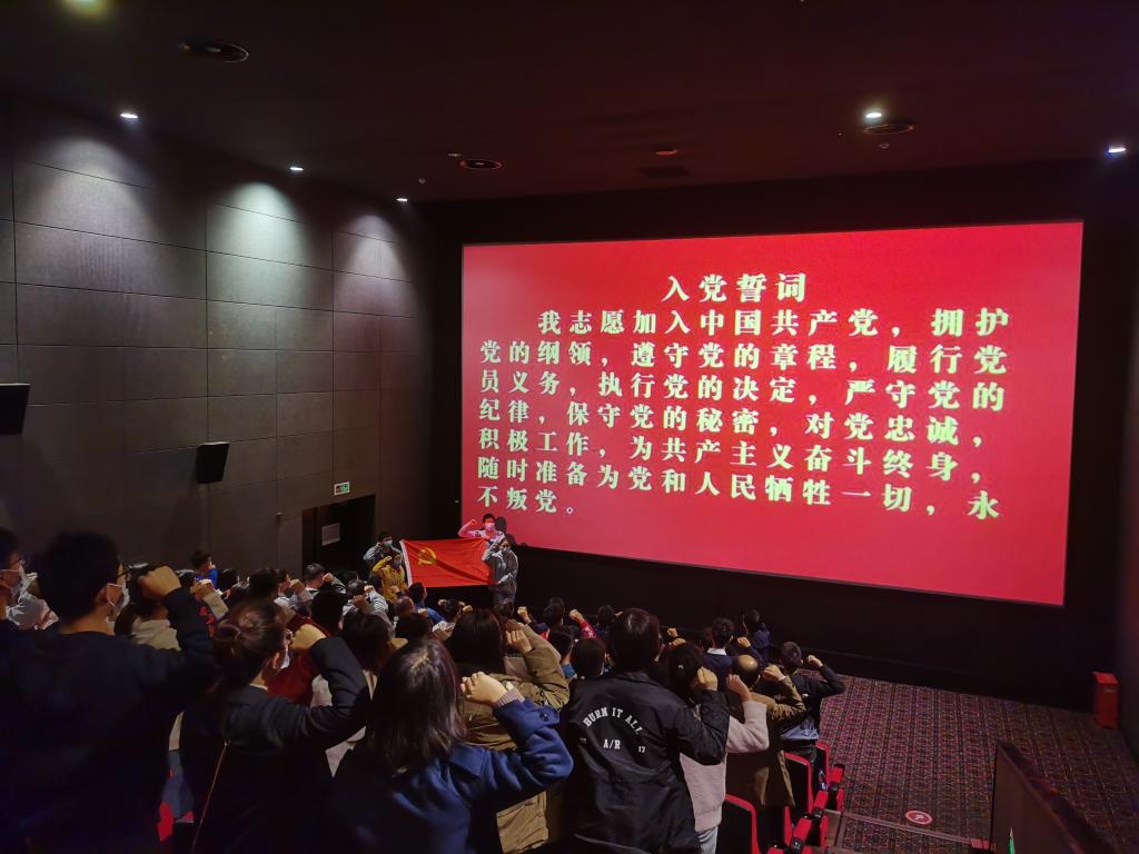 观看影片前,学院党委青年委员崔鹏带领全体师生党员面向党旗重温入党誓词。电影《长津湖》以抗美援朝战争中长津湖战役为背景,以英雄团队“穿插连”战斗行动为主线,选取战争中的重大事件、典型场景、主要行动和代表性人物,将抗美援朝精神生动形象地呈现在观众面前,深刻诠释了爱国主义精神、革命英雄主义精神、革命乐观主义精神、革命忠诚精神。