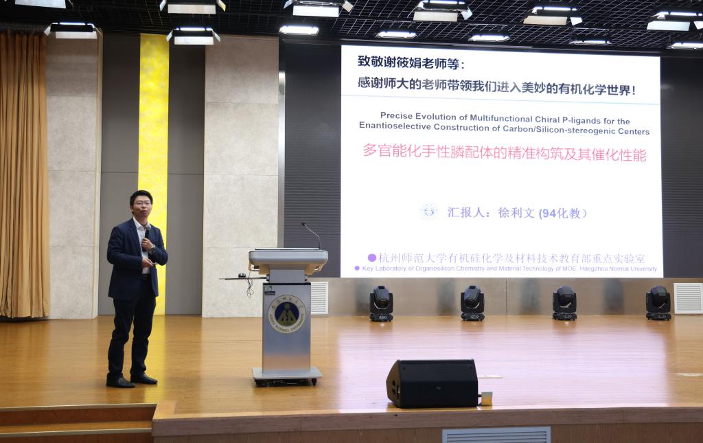 专家学术报告会由“功能分子固体”教育部重点实验室副主任郝二红主持。汪志勇教授作了题为《电化学催化的有机反应》的报告,介绍了课题组在该领域的代表性工作成果;刘心元教师分享了《手性阴离子-铜催化不对称交叉偶联反应》的报告,介绍了课题组在该领域的系列工作;徐利文教授作题为《Precise Evolution of Multifunctional Chiral P-ligands for the Enantioselective Construction of Carbon/Silicon-stereogenic Centers》的报告,并深情朗诵了一首自己创作的贺词:谢天谢地师常在,筱仙筱鹤一起拜。娟然如拭享天伦,寿比南山福如海。